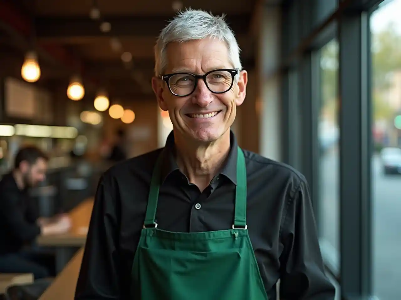 Tim Cook kama Starbucks malaika katika schwarzem Hemd und grüner Schürze