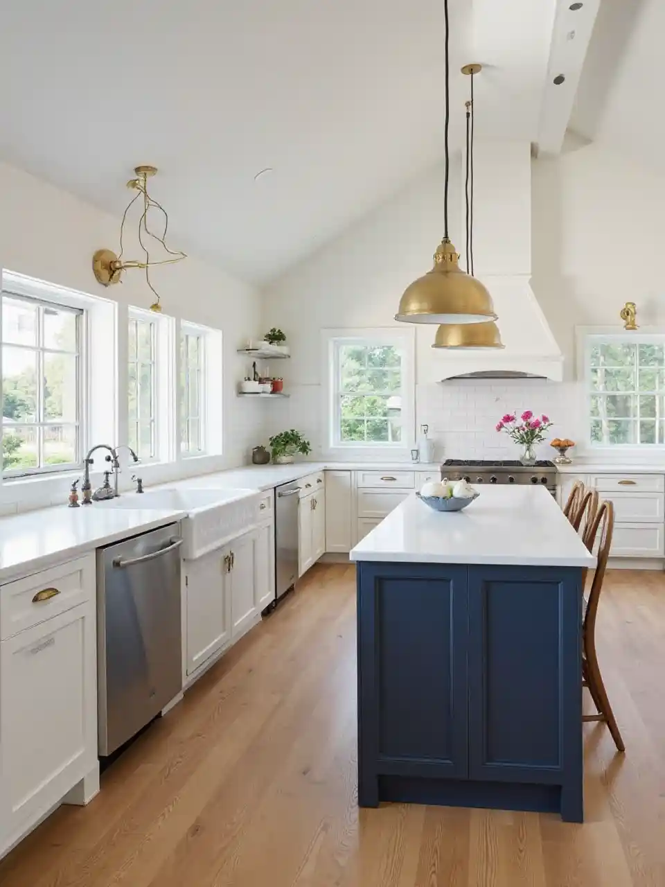 Tengeneza picha halisi ya jikoni maridadi, lisilo na wakati, lenye safu ya mbao, kabati nyeupe zenye vifaa vya shaba na kisiwa cha meli ambacho kina nafasi za watu 4