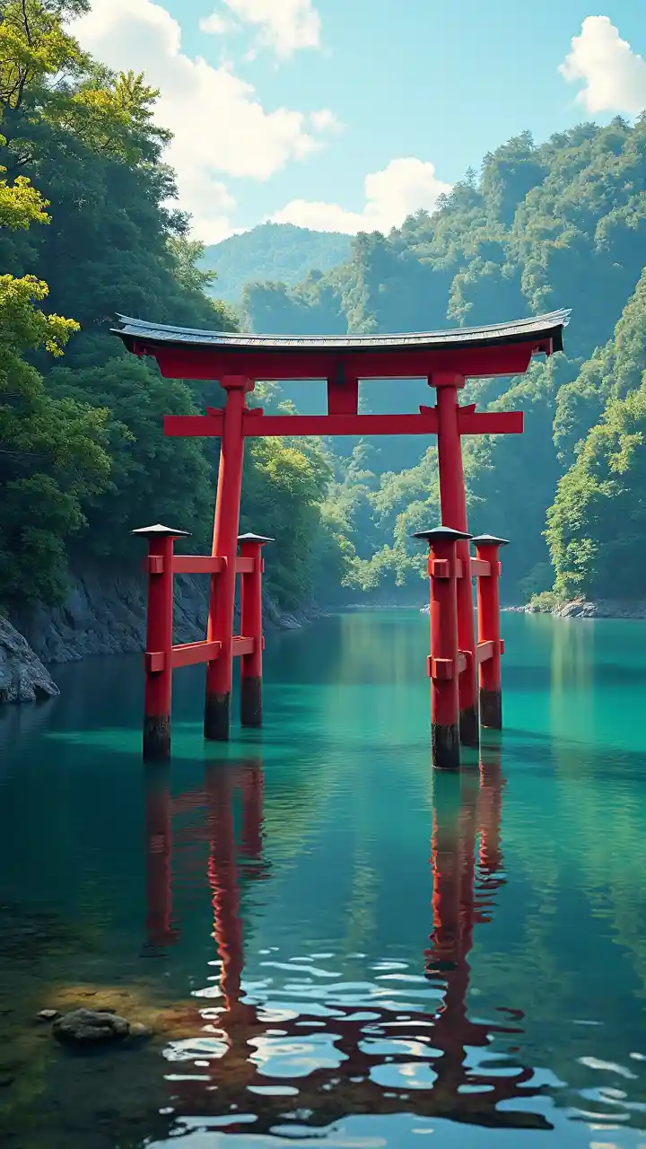 Red Torii lango katikati ya ziwa, msitu wa kina katika ukingo wa ziwa, rangi mkali, utamaduni wa Kijapani, photorealistic, tofauti mwanga