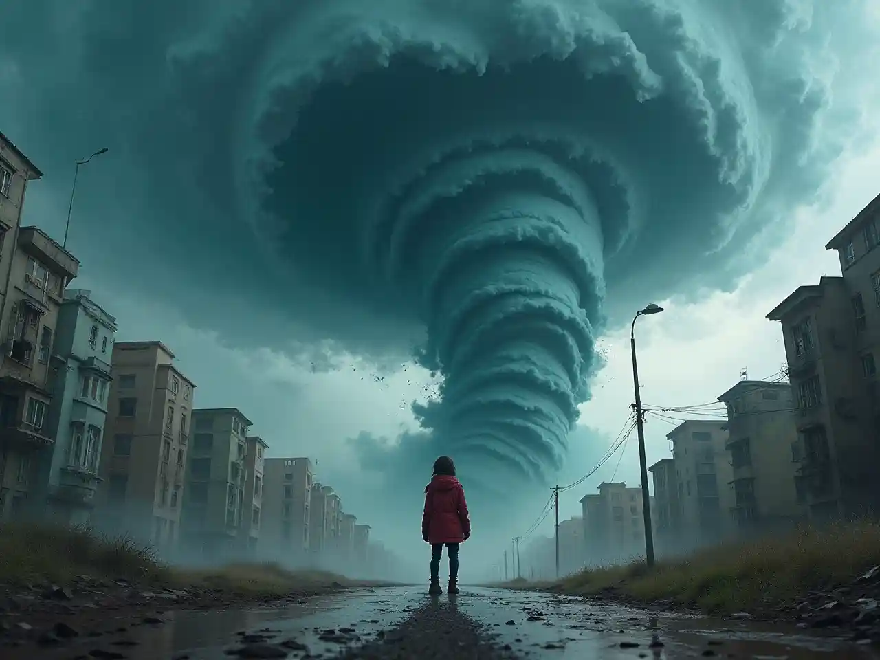 mtoto mmoja kusimama, huzuni, uchoraji mafuta, kubwa kuingiliana kimbunga swept mji, ultra-pana risasi, uharibifu, maafa ya asili, rangi baridi, utungaji Epic, uwiano wa, masterpiece, kushinda tuzo, HD, 64K,