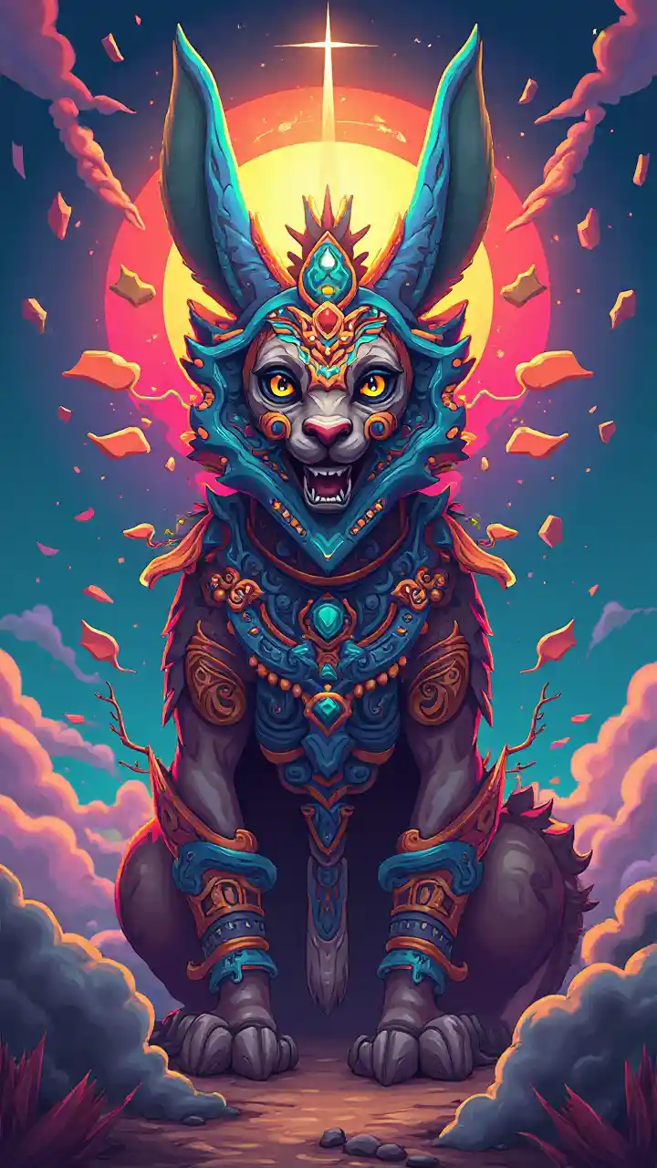 Totem mnyama Aztec greeble kabila style fanart ornamented fantasy firestone Ankama GTA5 cover style, rasmi Behance HD artstation, aliongoza na Jesper Ejsing, RHADS, Makoto Shinkai, Lois van Baarle, Ilya Kuvshinov, Rossdraws; na rangi ya pastel na rangi, na radiating anga anga, kipande ni ngumu na kifahari na umakini; picha kuunganisha uchoraji digital na sanaa ya dhani, iliyotolewa katika mwisho mat, iliyoundwa na ushawishi kutoka WLO, Artger, Greg Rutkowski, na Alphonse Mucha, kufikia ubora wa master.