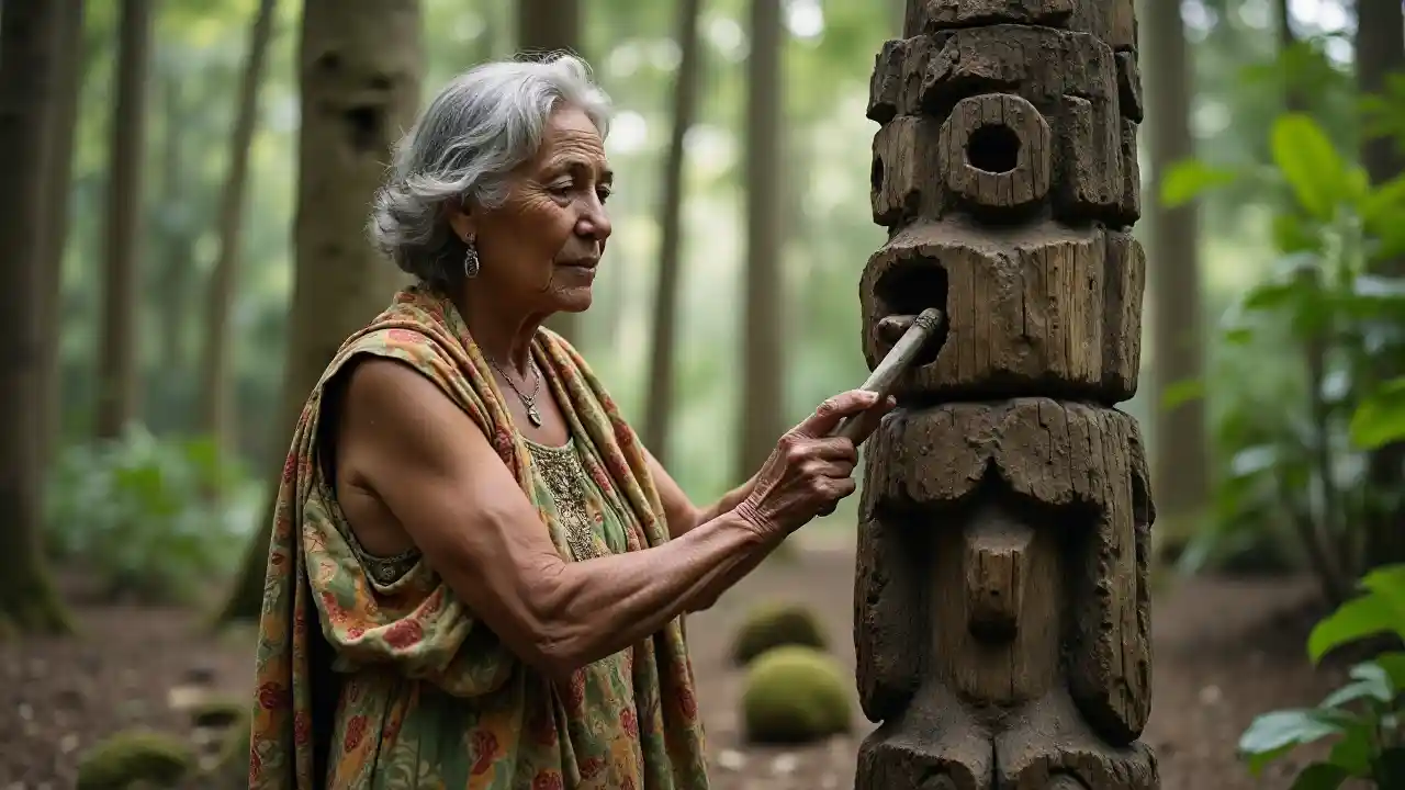 Mwanamke mmoja mwenye umri wa miaka 75 kutoka Amerika ya Latini, akiwa amevaa shati na mavazi yaliyochongwa kwa majani, akichonga sanamu katika eneo la msitu. Miti mirefu na ndege wanaopaa wanapamba sura yake, na mishale yake yenye nguvu inatoa uumbaji na hekima ya kidunia katika mazingira matulivu ya asili. Kazi yake huitukuza nchi.