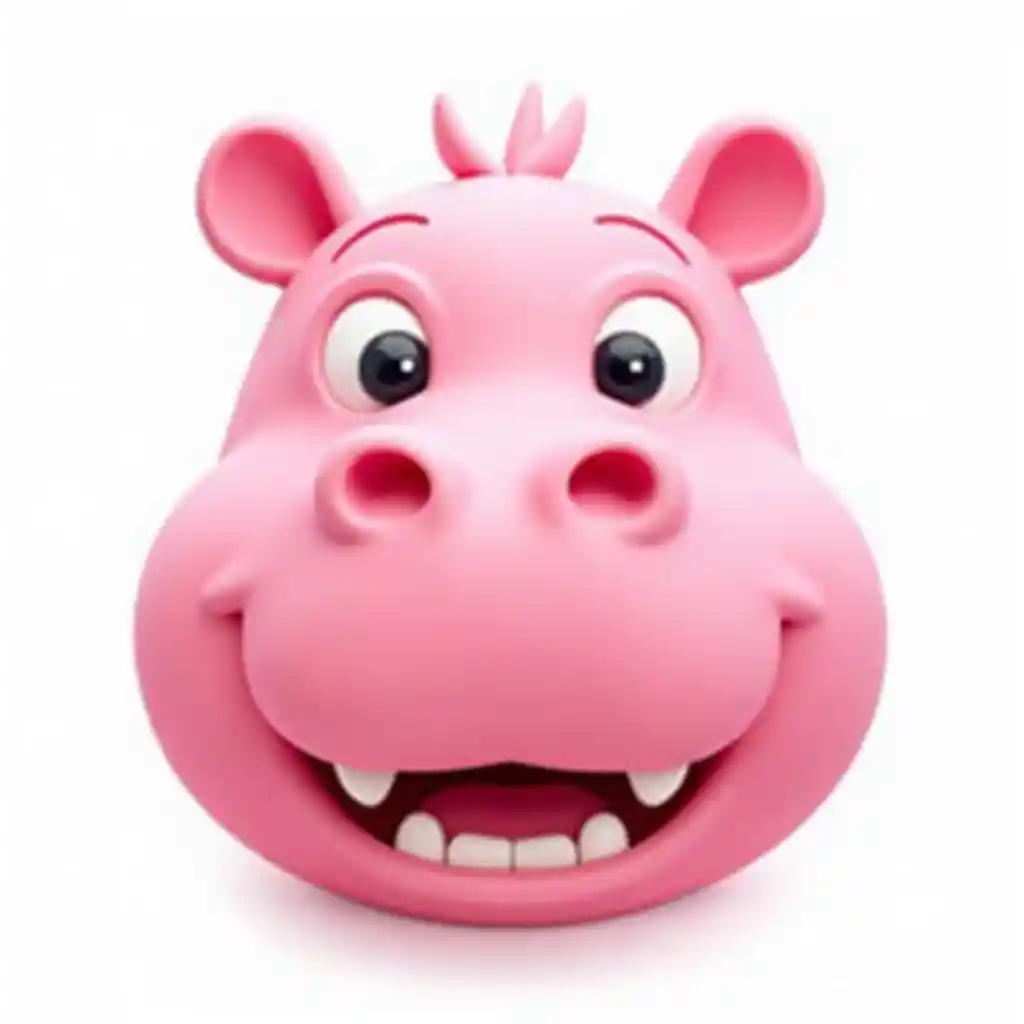 cute, rahisi toy-kama nyani nyekundu uso na background nyeupe. Kinywa cha kifaru hicho kimefunguliwa wazi, na kuonyesha fizi zisizo na meno. Ana macho makubwa, pua iliyopinduliwa, na uso wenye shangwe. Uso ni wa rangi ya waridi mkali na ni laini, bila sehemu za mwili zinazoonekana. Muundo huo ni wa kucheza na unawavutia watoto