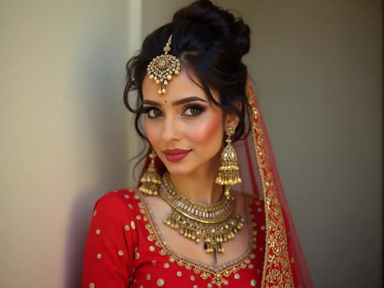 JBangladeshi bibi, mapambo minimalist, nyekundu jadi Bengali mavazi, pete pua, pete nzito, updo nywele
