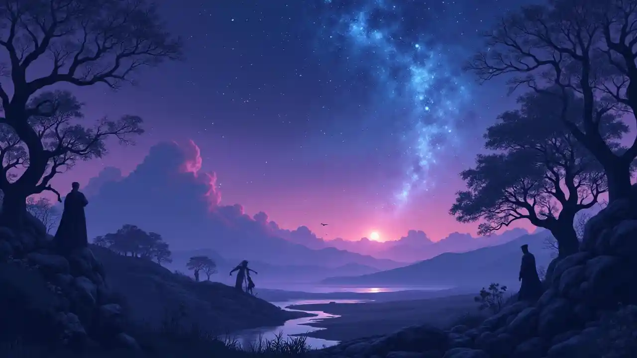 (tulivu tarot kadi picha), (anga ya jioni), mazingira surreal, silhouettes giza ya mapepo katika mbali, nyota wazi kuibuka, rangi ethereal jioni ya zambarau na bluu, vipengele mistic interlacing na background, kimya foreground, maelezo tata, anga ya kisiri na ya kutisha, azimio 4K, sanaa ya kina, kubuni ya kuvutia.