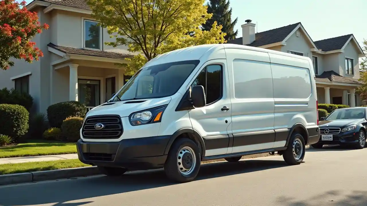 Gari la kifahari la Ford lililokuwa limesimama barabarani mbele ya nyumba ya vijijini, siku yenye jua, picha za matangazo, za kweli