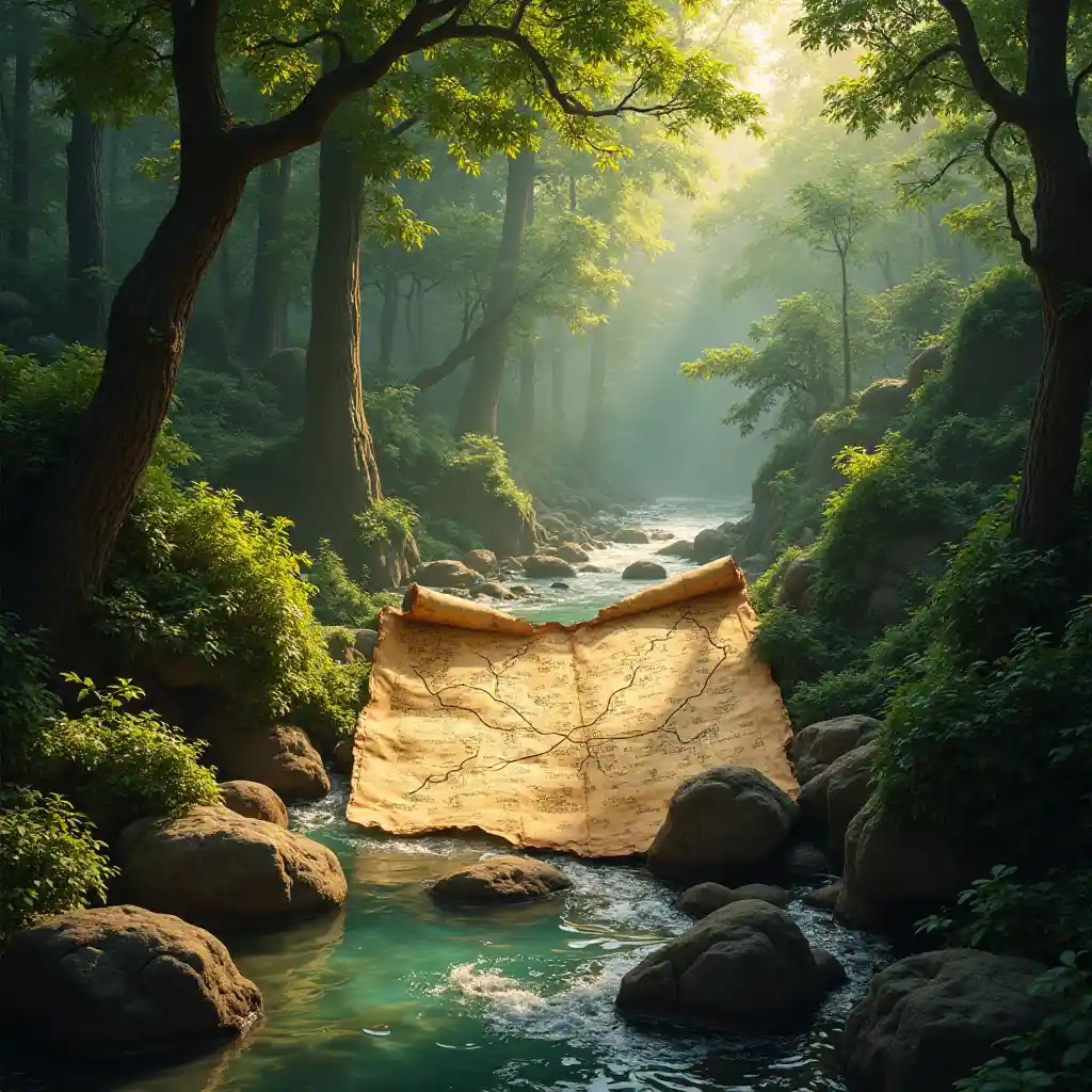 Ramani ya hazina ya kale, maelezo tata, mto unaotiririka upande wa kushoto, msitu wa kijani unaoficha ufalme wa zamani, rangi ya ngozi, rangi ya ardhi, enzi ya uvumbuzi, hisia ya adventure na historia, iliyoangazwa kwa upole na mwanga wa miti, 4K, mazingira ya ajabu.