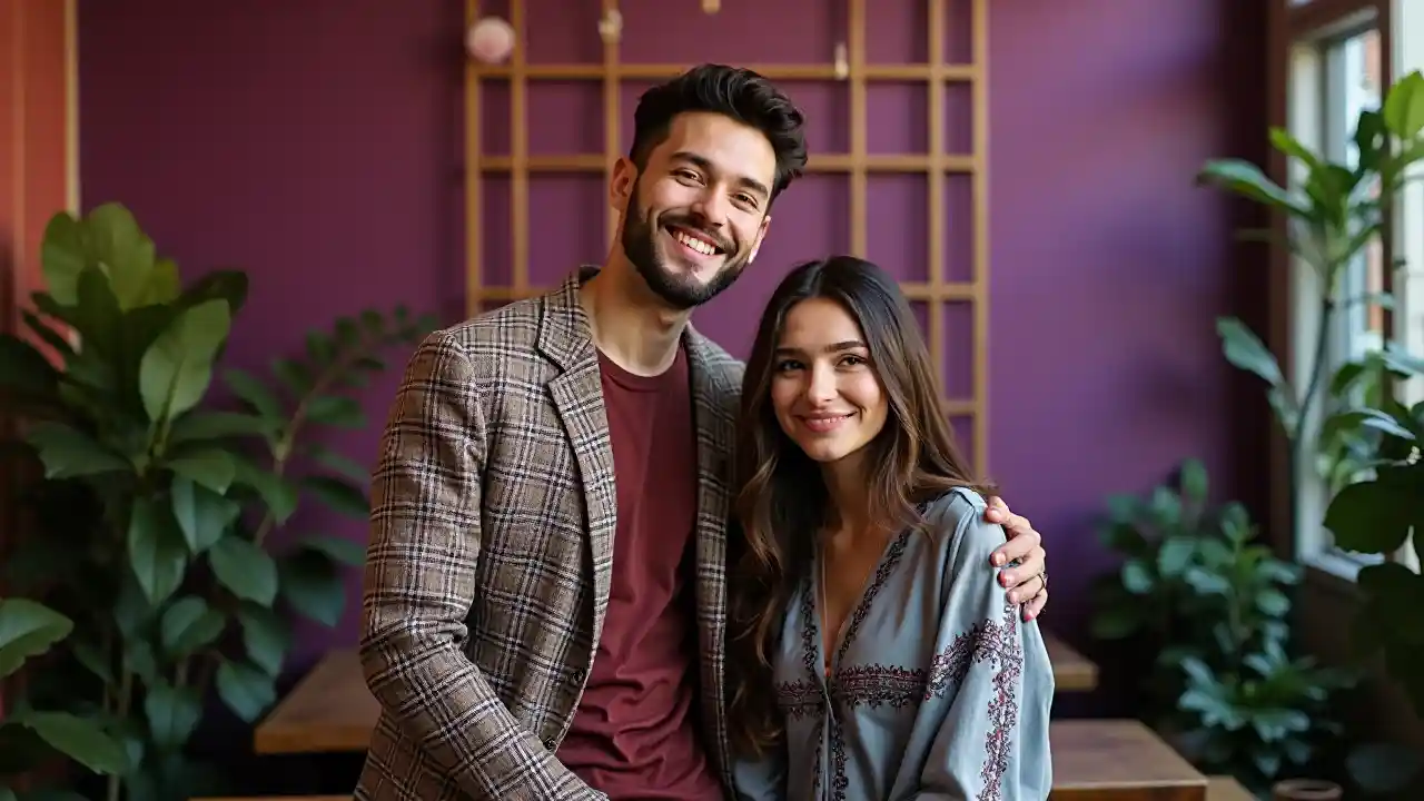 Kijana mmoja na mwanamke mmoja wanajipiga picha katika chumba chenye mitindo, kilicho na mimea mingi ya kijani na michoro ya sanaa ukutani. Mwanamume huyo, akiwa amevaa blazer ya rangi ya kahawia juu ya shati la rangi ya kahawia, anasimama kwa uhakika na tabasamu ya shangwe, huku mwanamke, akiwa ameketi kando yake akiwa amevaa kanzu ya kijivu iliyo na michoro ya kikabila, akitazama kamera kwa upole. Mahali hapo panaangazwa kwa nuru ya kawaida ambayo huonyesha kuta zenye rangi ya zambarau na gridi za dhahabu, na hivyo kuunda mazingira mazuri. Muundo huo unakazia uhusiano wao, huku akimpigia kwa upole, na hivyo kumfanya mwanamke huyo ahisi kwamba ana uhusiano wa karibu na anafurahia mazingira hayo yenye msisimko. Kwa ujumla, picha hiyo inaonyesha wakati wa furaha ulioshirikiwa na marafiki au wapendwa katika mazingira ya kifahari.
