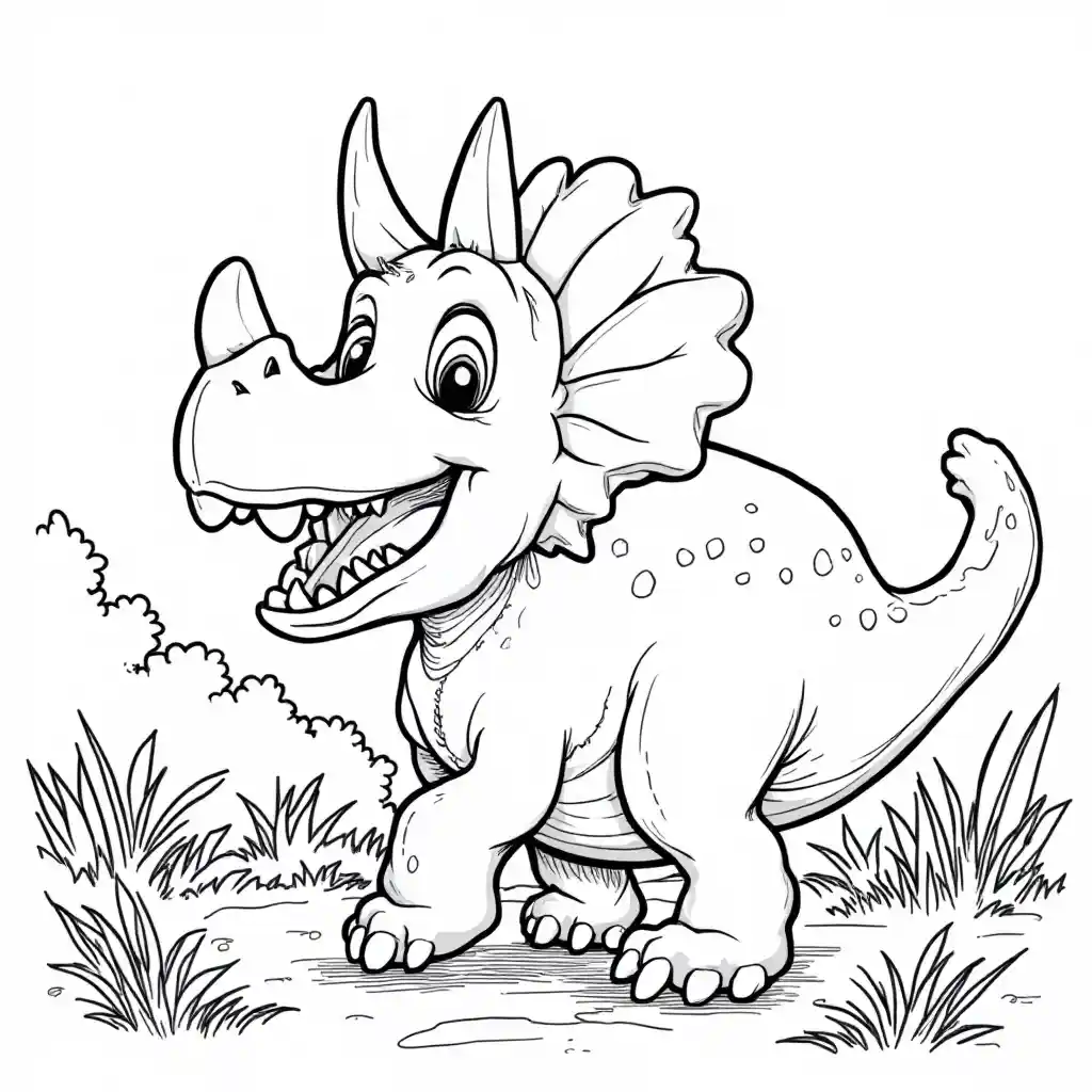 Ukurasa wa kitabu cha kupaka rangi kwenye msingi mweupe. Tengeneza ukurasa wa kupaka rangi unaoonyesha dinosaa Triceratops akitabasamu msituni. Triceratops inapaswa kuonyeshwa kwa njia ya kucheza na ya kirafiki, inayofaa watoto. Hakikisha kwamba alama za pekee za dinosaura, kama vile pembe zake tatu na vipande vyake, vinaonekana wazi. Mazingira yanaweza kuwa ya kawaida, kama vile uwanja wenye nyasi au mandhari ya kale. Picha inapaswa kuwa na habari za kutosha ili kuvutia lakini isiwe ngumu sana kwa watoto kuipaka rangi. kubwa ya mifupa ridge ambayo inapanuka katika nyuma ya skullfull yake, mwili, style: rahisi line illustration, Disney style, rangi, bold sana line, line art, clipart, nyeusi na nyeupe tu, si kutumia kiji