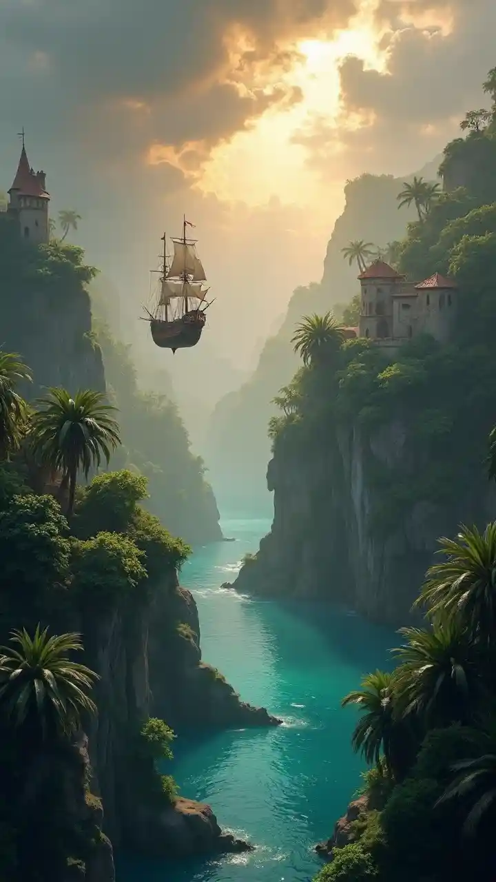 Picha ya anga ya bwawa la turquoise lililozungukwa na mimea ya kitropiki , mitende na miamba na meli ya maharamia inayoelea . Ukungu. Maporomoko ya maji. Nyumba za majinga na ngome iliyo juu ya miamba. Jambo la kushangaza zaidi ni anga . Mawingu mazito na yenye mawimbi yanaenea angani, yenye uzito na rangi ya kijivu, kahawia, na bluu. Mawingu hayo yanaonekana kuwa yamegawanyika kwa kadiri ya kutosha kufunua mstari wenye kung'aa wa nuru nyembamba, ya dhahabu karibu na upeo wa macho, ikidokeza au kuchomoza kwa jua. Nuru hiyo huangaza kwa upole katika mandhari, ikitoa mwangaza usioonekana ambao huongeza kina na fumbo la mandhari hiyo. Mtindo wa Uhalisi wa Karne ya 19.
