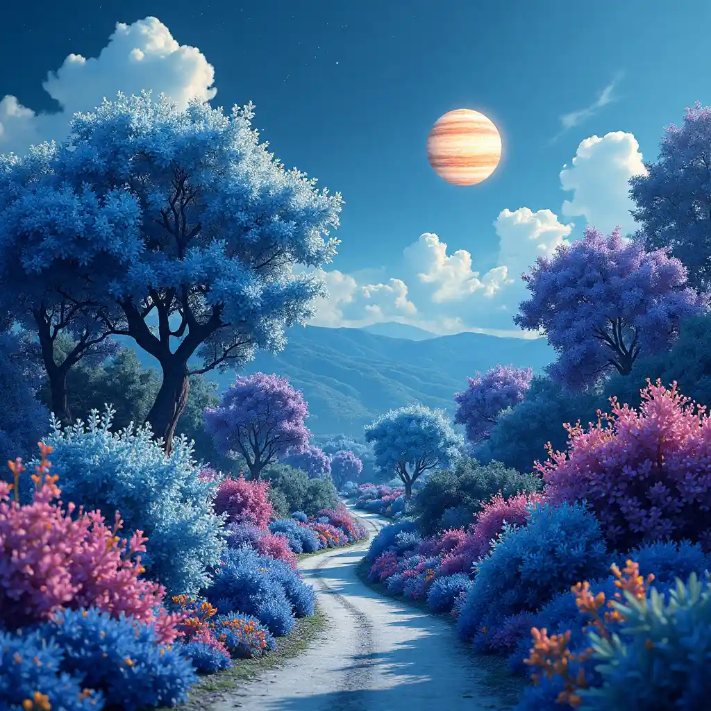 kundi dogo la miti, maua na mimea ya kitropiki, jambo la ajabu lilikuwa rangi ya mimea yote, mimea yote na miti yote ilikuwa imepakana rangi baridi, kutoka bluo ya bahari, hadi ameta, kupitia bluo ya umeme, lavenda na zambarau. Sayari ya Saturno katika upeo wa macho