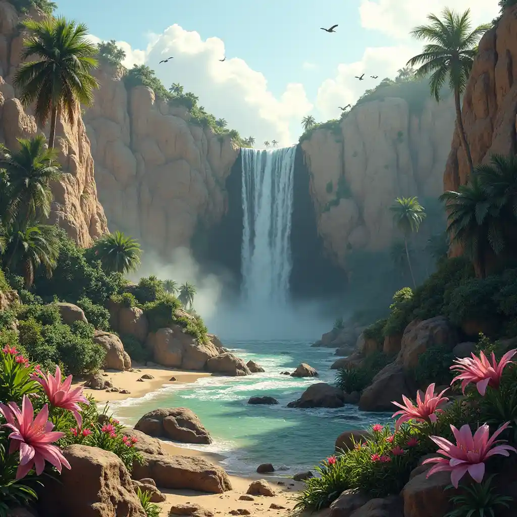 Mawe ya mchanga na eneo kavu . Maporomoko ya maji ya juu yenye kushuka mara mbili . Mimea ya kitropiki , maua ya kitropiki , machipukizi ya waridi , mimea ya kitropiki yenye rutu na mitende . Ndege wanaoruka angani . Nuru ya jua . Ukungu