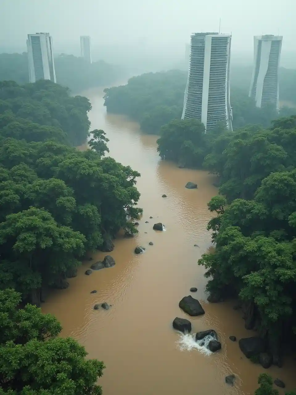 Picha ya anga ya mto mkubwa wenye matope katika eneo la kitropiki . Mto huo umefurika , na kufagilia mbali msitu wa kitropiki ulio karibu na miti iliyozama . Katikati ya mto majengo ya kisayansi ya futuristic nyeupe yanasimama kwenye miti iliyozungukwa na mimea ya kitropiki . Mto huo huingia katika milango midogo ya maji ambayo ukungu huinuka . Mawe katika maji . Ukungu . Vumi huinuka kutoka kwenye miti . Anga lenye mawingu