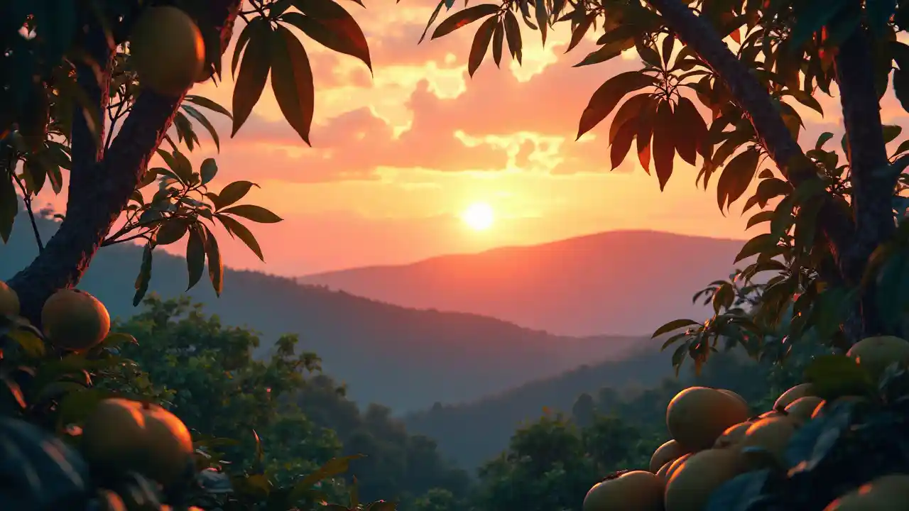 Mango na matunda ya kitropiki katika msitu ulio mbele, nyuma isiyo wazi na machweo rangi ya kupendeza asili sanaa upeo wa macho safu ya milima mandhari ya anga uzuri wa kisanii mazingira ya rangi asili picha sunset msukumo