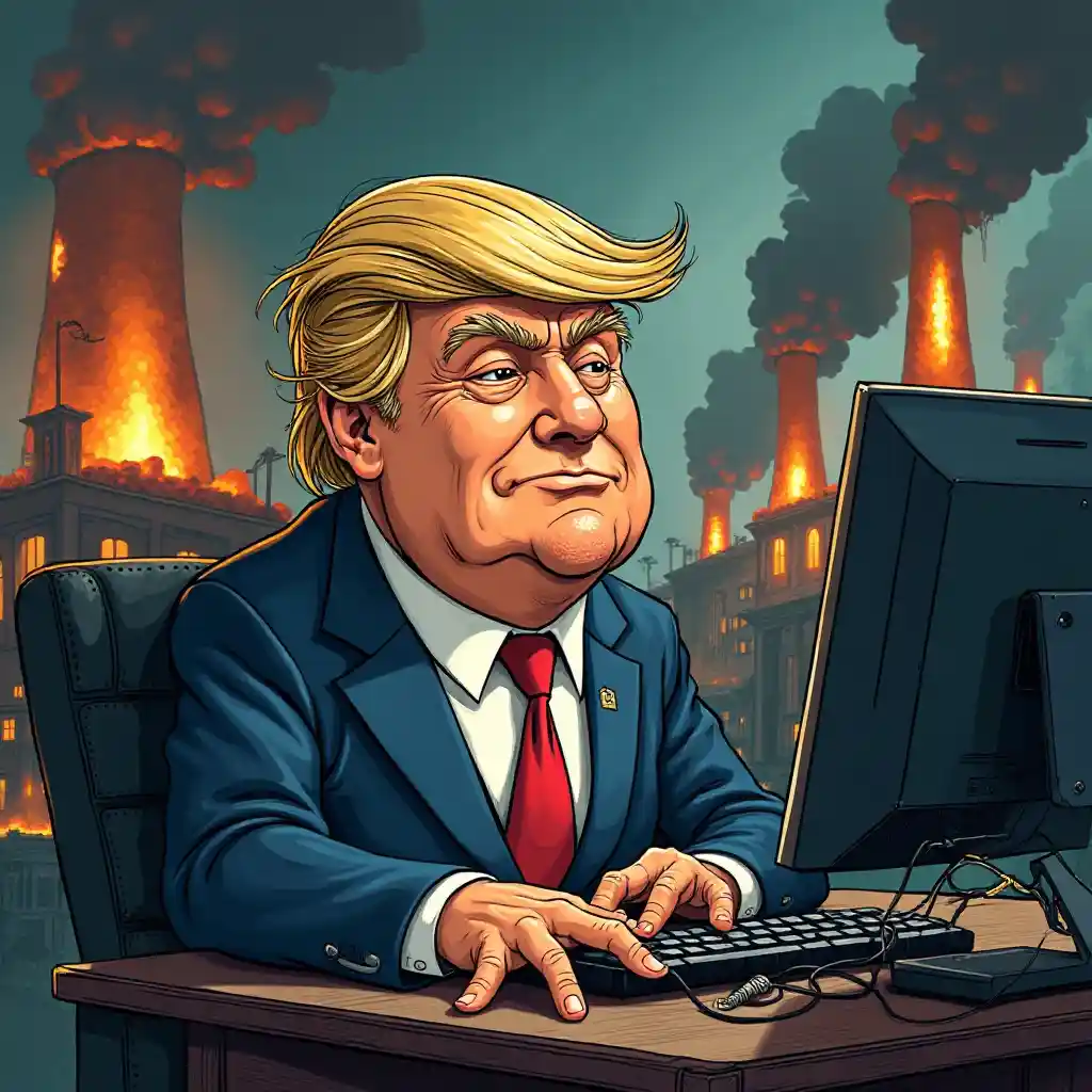 Donald Trump ameketi mbele ya kompyuta inayotumia makaa ya mawe, sura ya kujistahi, moshi unaozuka, mtindo wa katuni uliopuliziwa na Herbert Block, anga ya ucheshi, hisia zilizopinduliwa, rangi zenye nguvu, taa zenye nguvu, hali ya ucheshi, mtazamo wa ucheshi, msisitizo mkubwa juu ya ucheshi wa mazingira, maelezo ya juu, mistari ya wazi, tofauti za ujasiri, sanaa ya katuni.