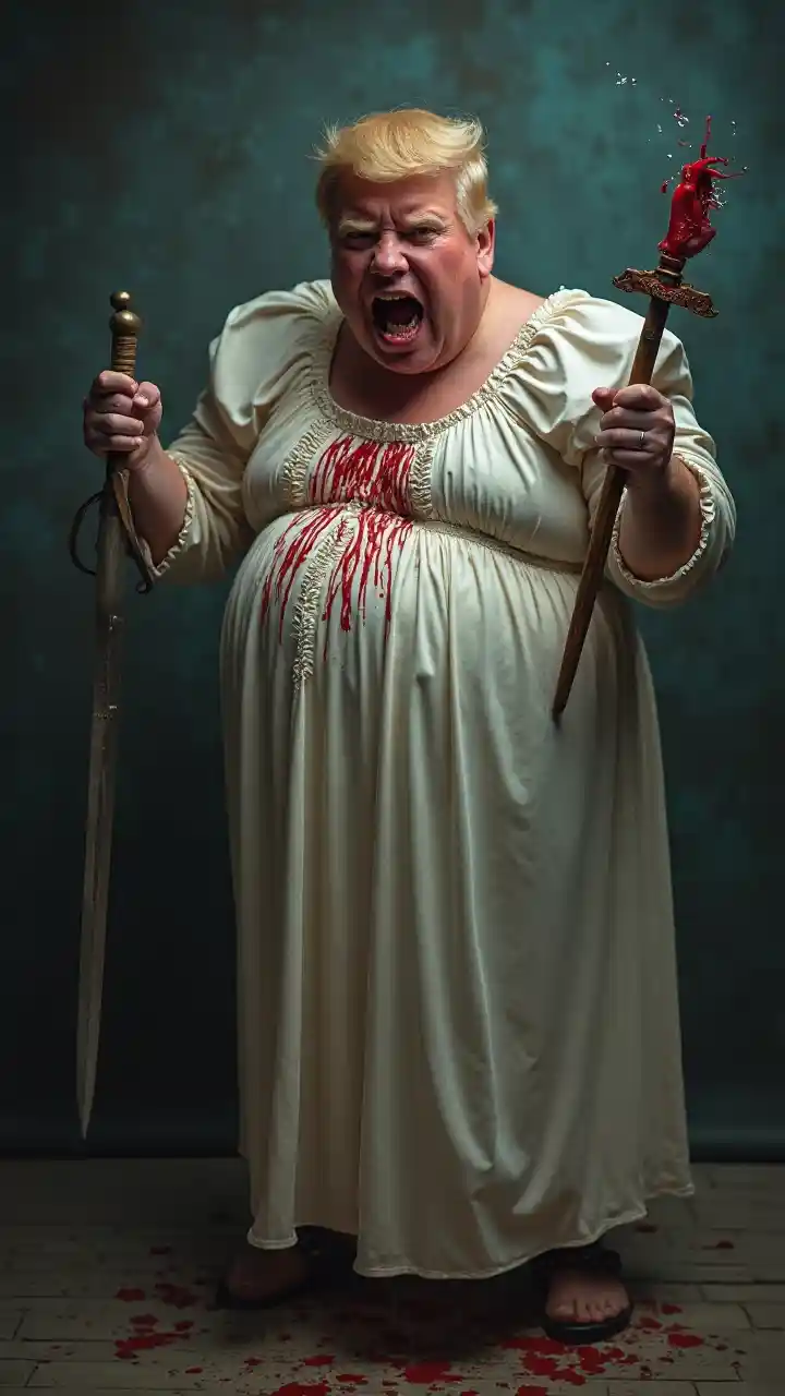Picha ya mwili mzima ya Donald Trump mwenye uzito mkubwa akiwa amevaa mavazi ya Cinderella; kinywa chake kimefunguliwa na meno yake makali na damu ikitoka kinywani. Ana fimbo ya uchawi yenye ncha inayofanana na upanga, na moyo wa mwanadamu umepigwa.