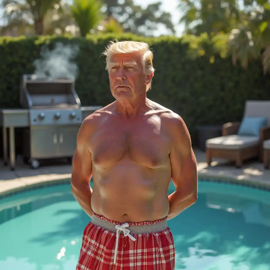 Donald Trump katika mavazi ya kuogelea, karibu na barbeque, na bwawa nyuma, njia ya kupiga picha, kweli sana, kina cha uwanja