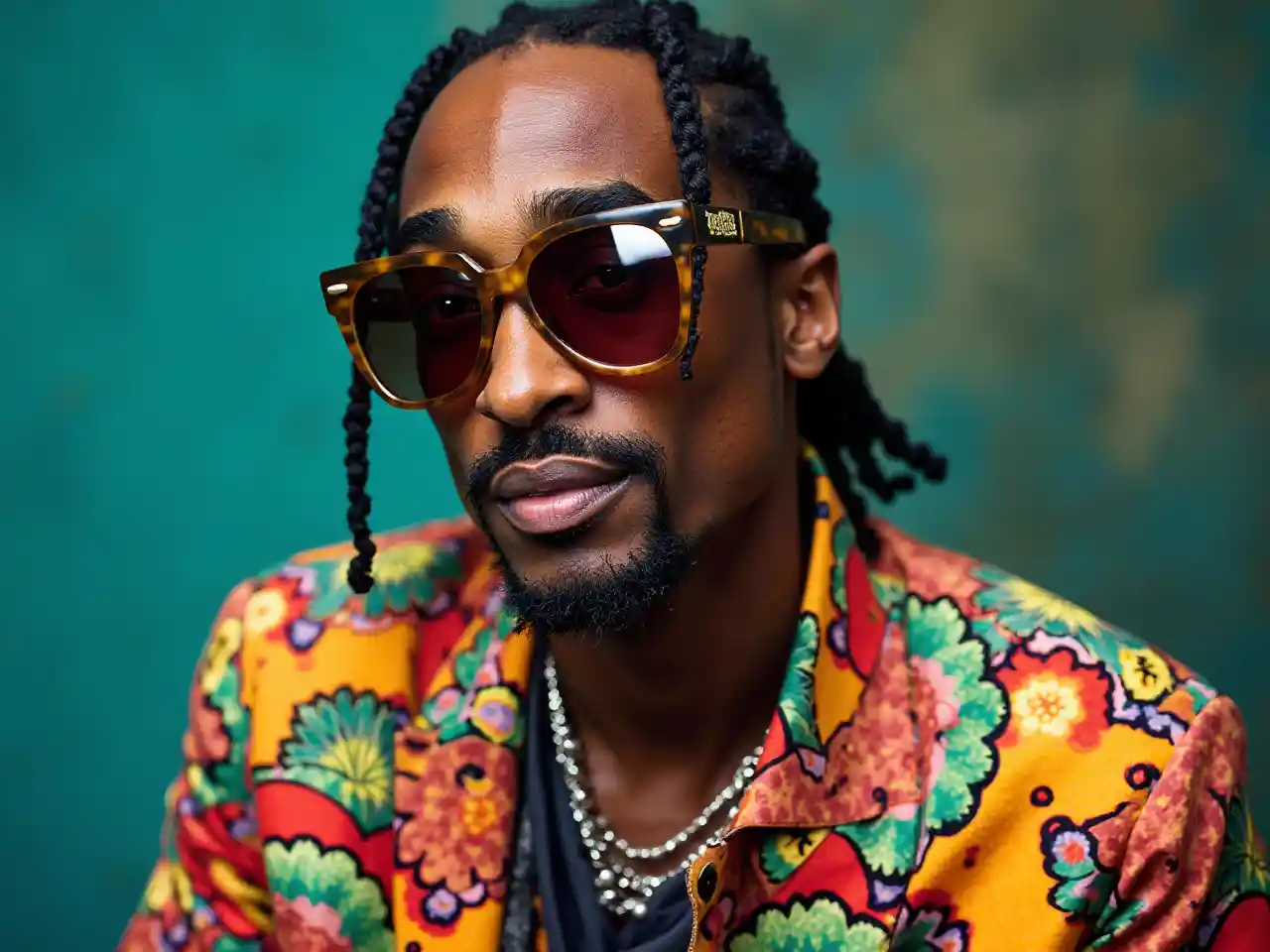 Tupac akiwa amevaa koti lenye miundo mkali na miwani ya njia, rangi zenye nguvu, rangi ya kutofautisha