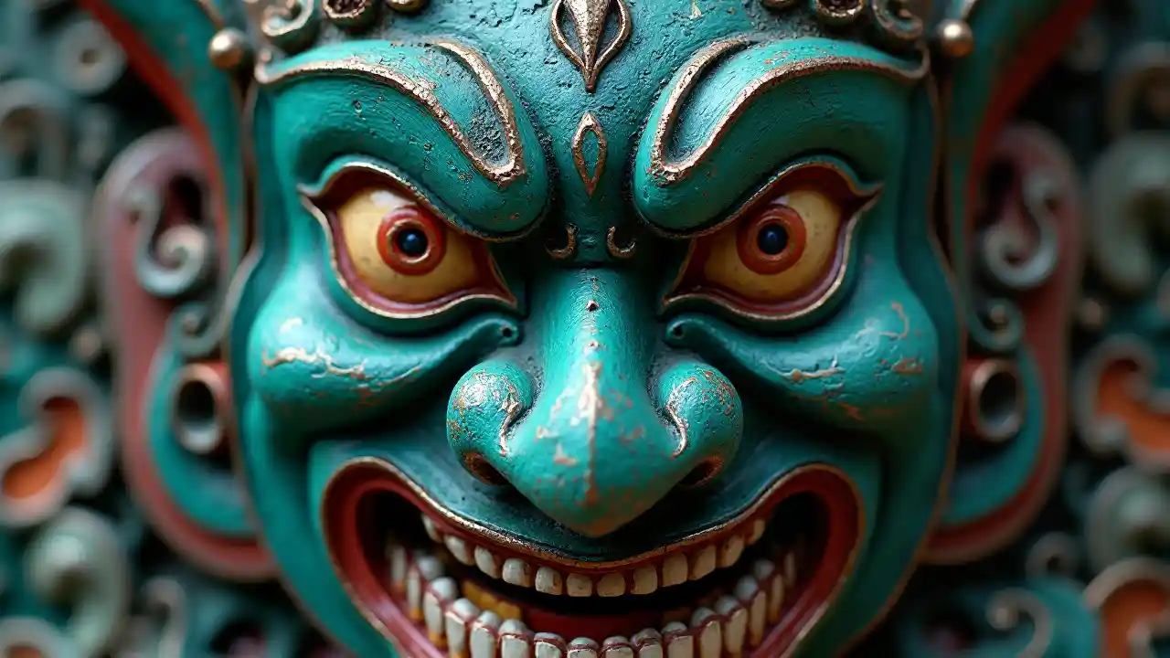 Kicheko cha Kijapani cha Oni cha Mbao na Rangi za Turquoise