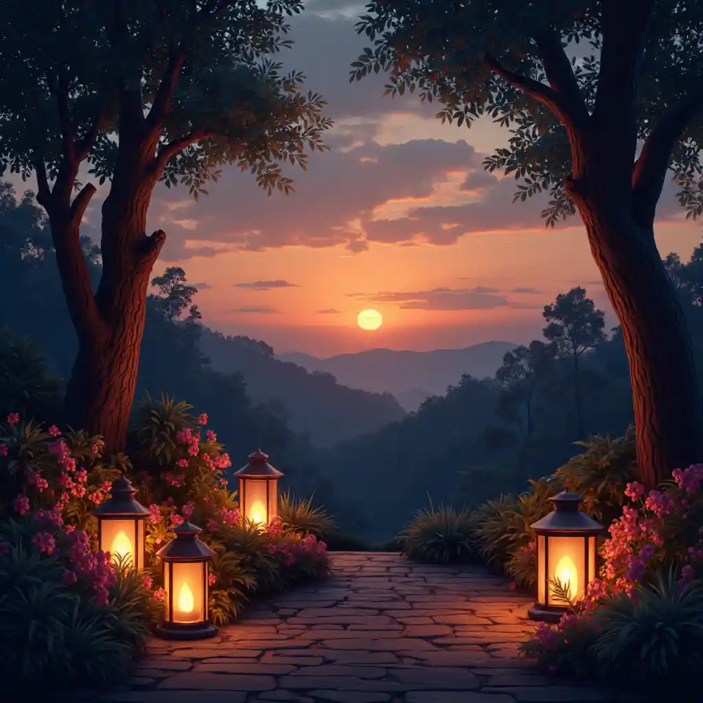 Jioni njema Kucheza , joto jioni anga, anga utulivu na gradient ya rangi ya machungwa muted na rangi ya zambarau, nyota nyeti kuanza twinkle, baridi baridi rustling majani, anga cosy kuwakaribisha kupumzika, taa mwanga kwa upole mazingira ya bustani, ultra- kina, high definition, kina anga kujenga mood utu.