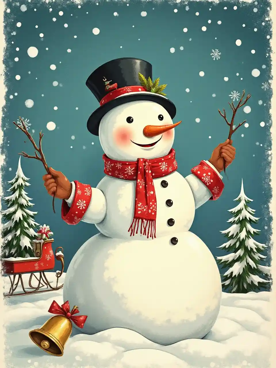 Mwanamume wa theluji akiwa mbele ya kadi ya Krismasi ya Austria, Tirol iliyojaa picha za majira ya baridi, iliyo na kengele za kuendesha magari ya kuendesha magari ya kuendesha magari ya kuendesha magari ya kuendesha gari na vipande vya theluji