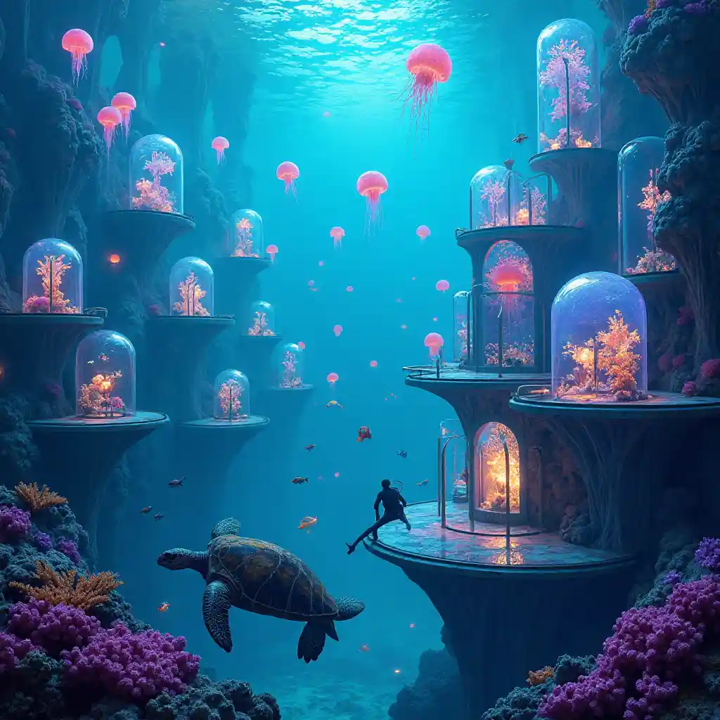 Jiji la chini ya maji, mandhari yenye kuvutia yenye majivu, minara yenye kung'aa ya matumbawe, nyumba zenye madini, zinazounganishwa na njia za kutembea, mtumbwi wa wakati ujao akisafiri kwa maji pamoja na kasa mkubwa wa baharini, samaki wenye rangi nyingi wakitembea, rangi za neoni, mazingira ya maji, nuru ya chini ya maji, na ufafanuzi wa 4K.