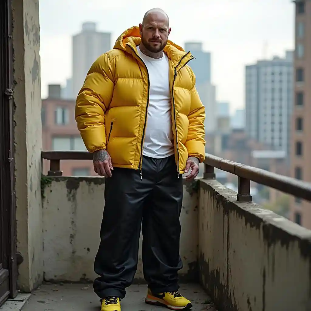 A brutal stocky bald bodybuilder in a shiny yellow down jacket stands on the balcony of an old apartment building, tattoos, beard, white T-shirt, black leather wide sports pants, view of the city with skyscrapers, Brightly colored sneakers