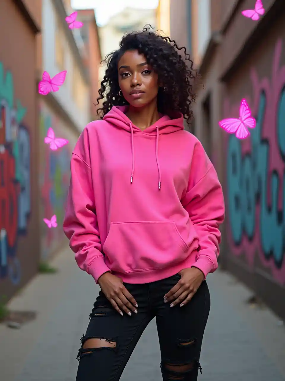 "Mfano wa kike mweusi mwenye ngozi nyeusi na macho ya kahawia, akiwa amevaa koti la rangi ya waridi na suruali nyeusi iliyopasuka, akiwa amesimama katika barabara ya maandishi ya rangi ya waridi na vipepeo vya rangi ya waridi. "Njia ya mtindo, yenye kujiamini, na mandhari yenye nguvu".