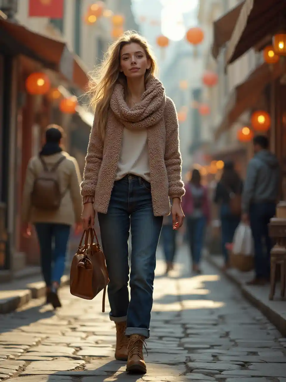 photorealistic, (mwanamke mrefu) kutembea chini bustling high street, (maelezo ya nguo) kuonyesha textures na mifumo, (mwanga asili) kujenga vivuli laini, anga ya nguvu na ya maisha, kukamata harakati na nishati karibu, maduka na watu katika background, (ultra-maelezo), rangi, kuibua joto na kuwakaribisha.
