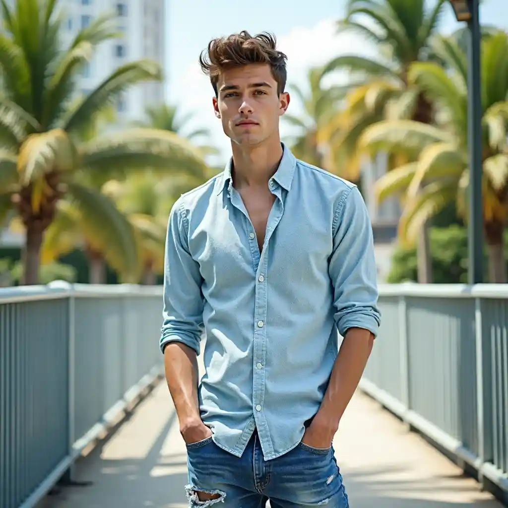 Kijana mmoja anasimama kwa uhakika kwenye daraja la kutumiwa na watu, akiwa amezungukwa na mimea yenye rangi ya kijani na jua linaloangaza. Anavaa shati la bluu nyepesi lenye vifungo, lililofunguliwa kidogo kwenye kola, na shati la jean lenye maumivu ambayo huonyesha mtindo wake wa kawaida. Mtazamo wake ni mzito lakini ni mtulivu, akionyesha mtazamo wa kutafakari huku akitazama mbali na kamera. Muundo wa madini wa daraja hilo na mitende inayoonekana nyuma ya daraja hilo inaonyesha kwamba siku ni yenye joto na jua linatoa, na hivyo kuunda mazingira ya mijini. Muundo huo, pamoja na mchanganyiko wa vitu vya asili na viwandani, huonyesha nguvu za ujana na uvumbuzi.