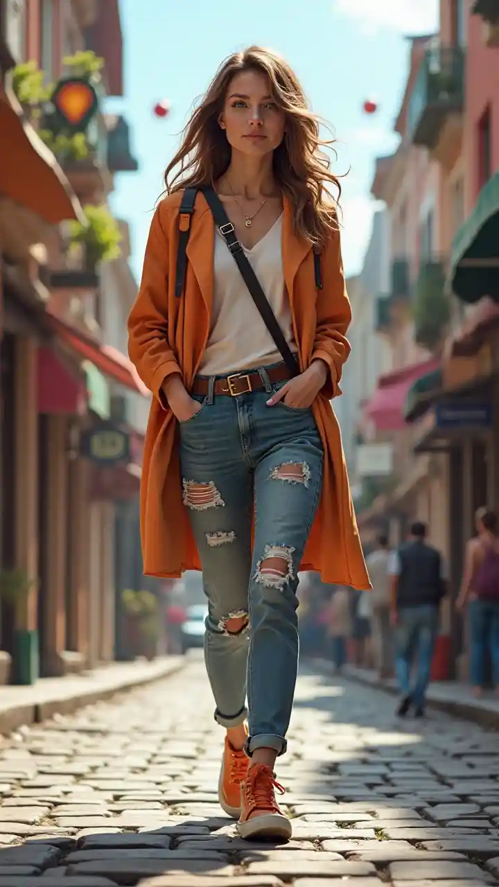 (mwanamke mrefu kijana kutembea chini ya barabara kuu), (kweli), nguo ngumu kina, taa ya asili, anga ya mji, mazingira ya mijini, background bustling, kuonekana, bado mtindo mavazi, rangi hai kukamata kiini cha mtaa nguvu, akielezea viumbe wote furaha na kisasa, ultra- kina, HD.