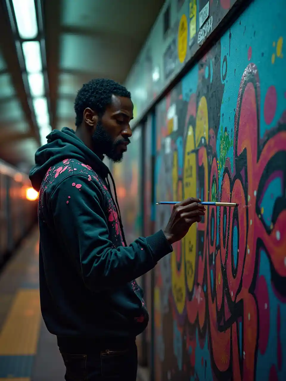 Akichora picha ya ukuta katika gari la chini ya ardhi lenye taa za neoni, mwanamume mweusi mwenye umri wa miaka 30 na kitu anaangaza akiwa na koti lenye rangi nyingi. Graffiti na treni zinazopita humweka katika mazingira, shauku yake ya ubunifu na umakini wake unaonyesha sanaa na ujasiri wa mijini.