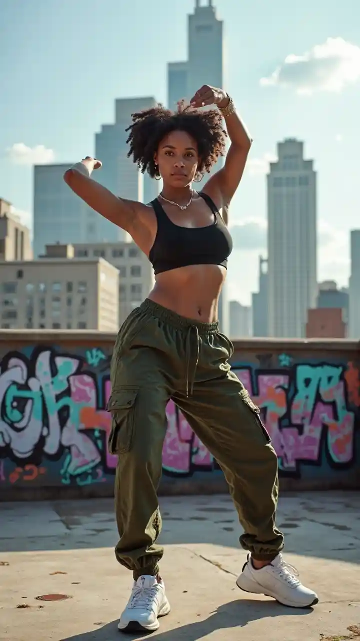 Akitenda kazi ya muziki wa hip-hop juu ya paa la jiji, mwanamke mweusi mwenye umri wa miaka 20 na kitu anaonekana akiwa amevaa suti ya michezo na suruali za mizigo. Maandishi ya kuchorwa kwenye madhabahu na majengo ya kuinua mbingu huonyesha nguvu zake, na uzuri wake wenye ujasiri huvutia.