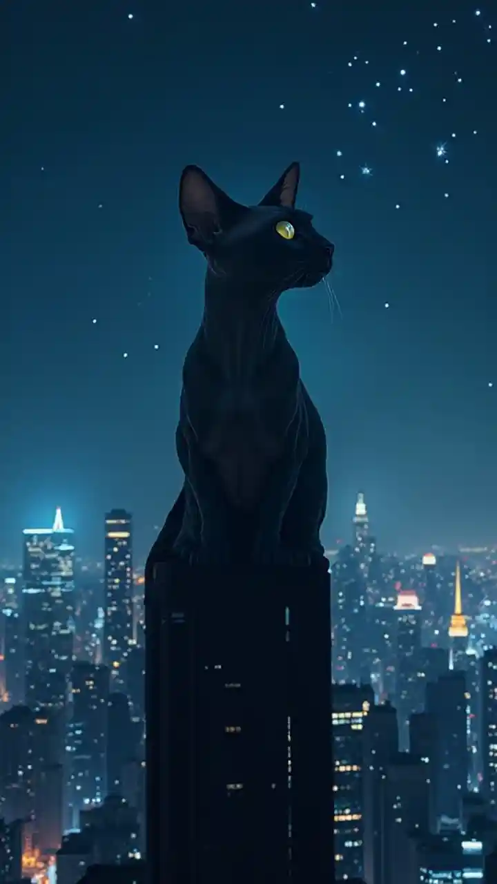 Paka mweusi mwenye rangi ya sphinx, msimamo wa kifalme juu ya mnara wa juu wa anga, anga ya bluu yenye rangi ya giza iliyo na nyota zinazong'aa, ishara ya fumbo la jiji, tofauti yenye kutokeza kati ya manyoya yenye kuvuza na mandhari ya jiji yenye mwangaza, sauti za baridi, hali ya sinema yenye mambo mengi, mazingira ya utulivu na yenye nguvu, mandhari ya usiku ambayo huonyesha hali ya upweke katika jiji lenye shughuli nyingi.