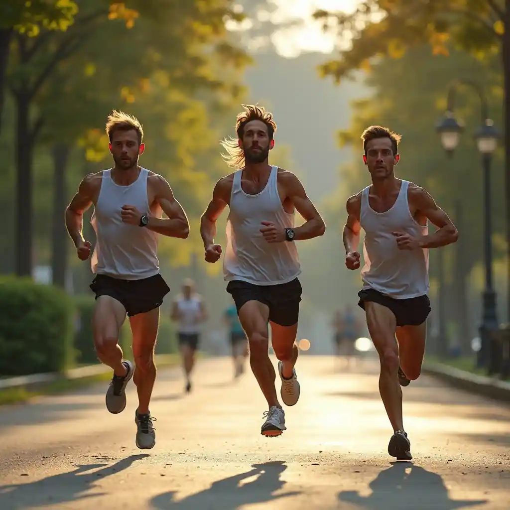 Mandhari ya nguvu ya mwanamke mmoja na wanaume wawili wanakimbia hadi miaka 40, bustani yenye nguvu, mwendo mkali na nishati, kuonyesha ushindani, mavazi ya riadha, jasho linang'aa, mwanga wa jua unaotengeneza vivuli, sauti za asubuhi, anga iliyo na uamuzi na gari, maelezo ya barabara na mazingira, ufafanuzi wa juu, wa kina, wakikamata roho ya kukimbia na ushirika, << THE_MARKER>> wanakimbia kupitia mazingira ya mijini.