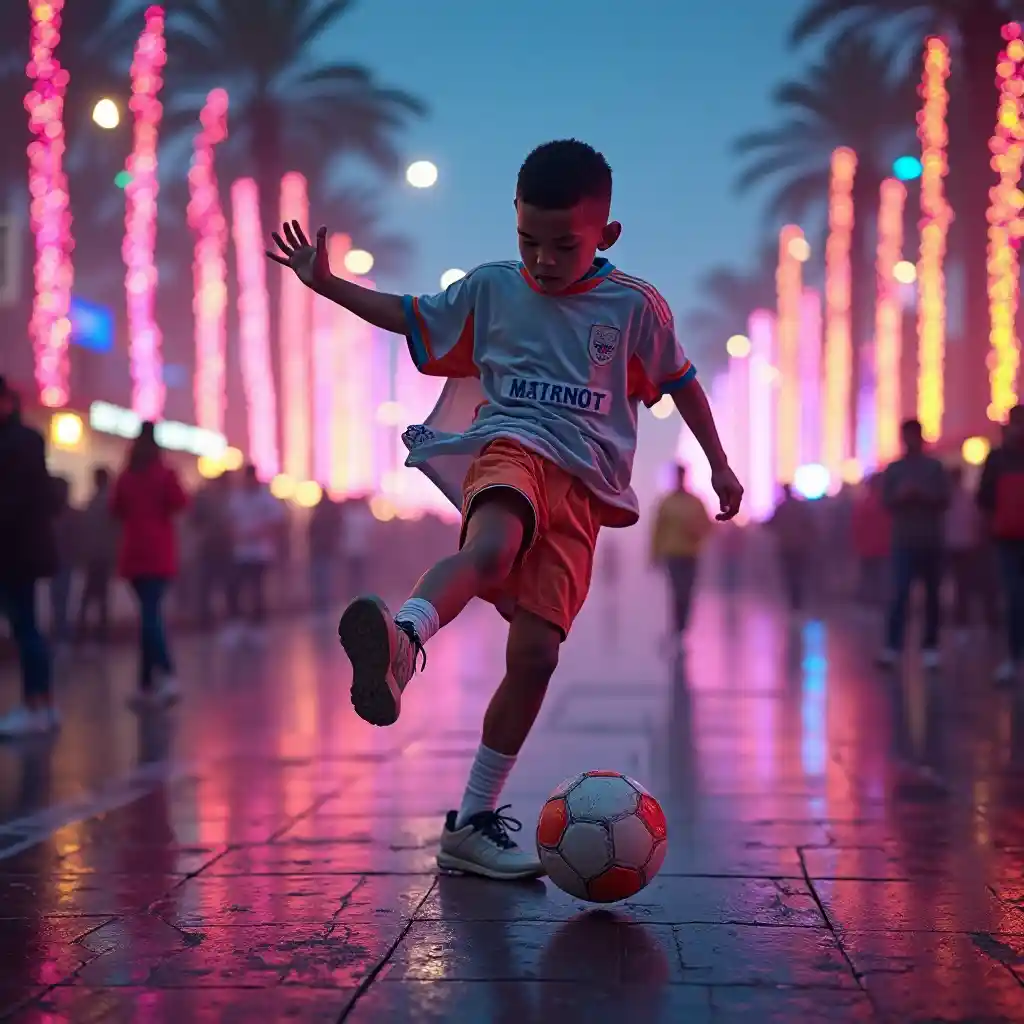 Akikimbia mpira wa miguu katika uwanja ulioangazwa na taa za neoni, mvulana mweusi mwenye umri wa miaka 9 akiwa amechunwa nguo na viatu vya mazoezi. Umati wa watu wenye shangwe na chemchemi za hologramu humweka katika picha, picha zake zenye nguvu zinatoa shauku na nishati yenye nguvu katika eneo lenye shughuli nyingi.