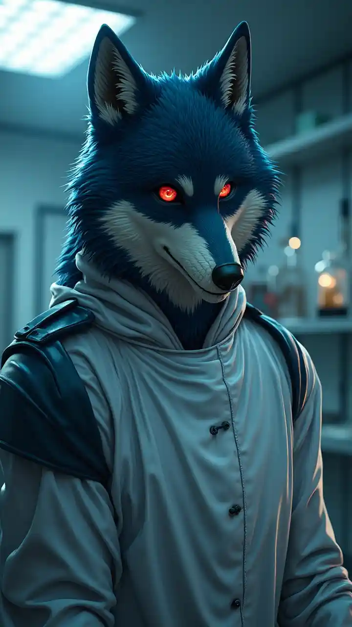 Haunting portrait of a biomechanical vampiric wolf, featuring sleek navy-blue and arctic-white fur rendered in high-contrast cel-shading, anatomically detailed with glossy, crystalline texture. Blood-red eyes with retroreflective glow, prominent ivory fangs with subsurface scattering. Wearing a structured matte-white high collared surgical gown with precise fabric folds, military-style shoulder epaulettes, and traditional frogged closures. Cinema-quality black nitrile gloves extending to mid-forearm, exhibiting realistic latex specular highlights. Steampunk-inspired protective goggles with dark chromatic lenses perched on forehead, catching ambient rim lighting. Scene set in brutalist medical laboratory with dramatic chiaroscuro lighting, volumetric fog, and stark white tiles creating leading lines. Key light from overhead surgical lamp creating dramatic shadows and edge highlights. Background features out-of-focus medical equipment and specimen jars with ethereal bloom effects. Composition follows rule of thirds with dramatic Dutch angle. Art style combines dark fantasy manga aesthetics with detailed cross-hatching and precision linework. Atmospheric perspective with cinematic depth of field. Ultra-detailed illustration with emphasis on material properties and surface textures. 8k resolution, photorealistic rendering with anime influence, dark academia aesthetic