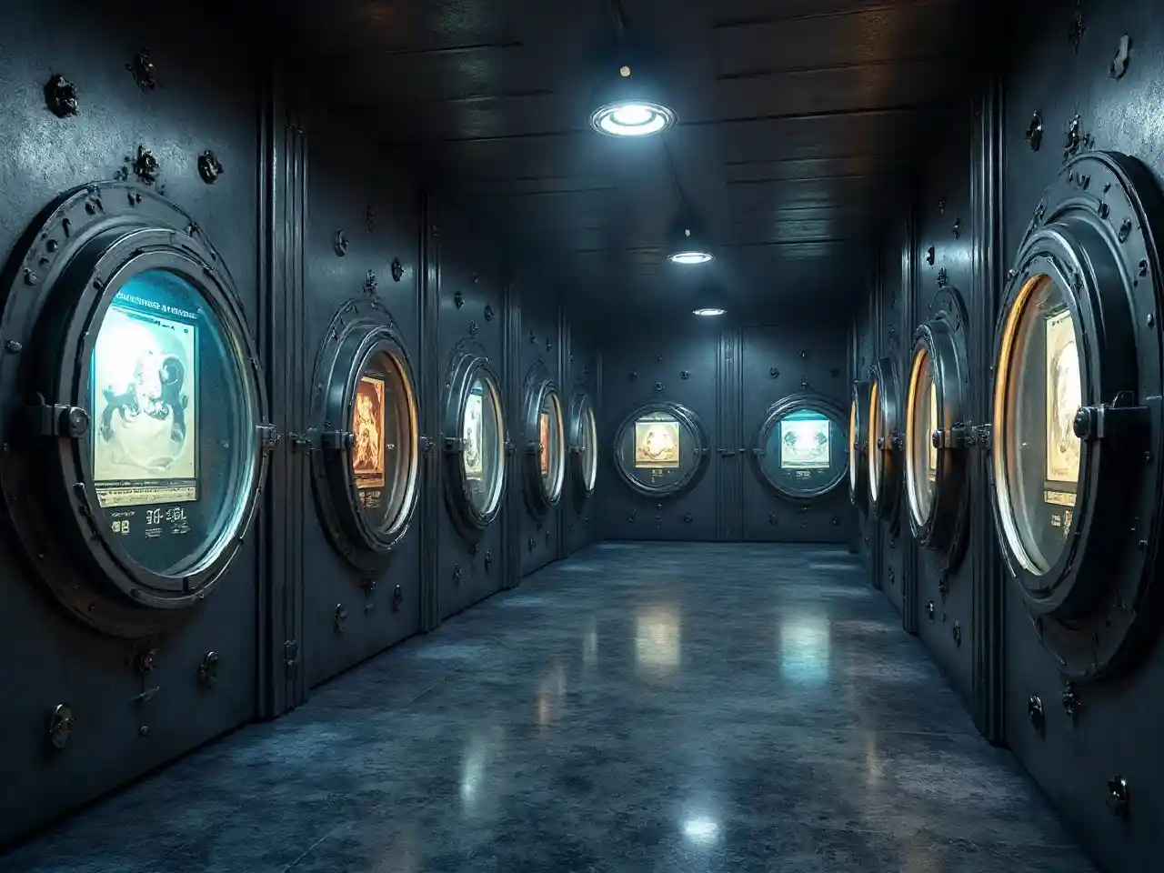 For a Vault-Themed Museum Atmosphere: Imagine stepping into a grand, secure underground vault designed as a museum. The walls are made of polished steel or stone, giving off a solid, impenetrable feel, with massive, riveted metal panels resembling those of a bank vault. Each NFT vault image (Common to Legendary) is displayed in a framed glass case embedded into the walls, surrounded by reinforced metallic frames. Soft, cool lighting illuminates the room from concealed sources, with a faint bluish hue reflecting off the metallic surfaces, creating an atmosphere of security and exclusivity. The floor is a dark, polished granite, reflecting the glowing vault displays and enhancing the sense of depth. Each vault image display is equipped with a small plaque or digital readout directly beneath it, detailing its rarity, ID, and AP. Alongside the plaques, small mechanical accents, such as spinning combination locks or glowing keypads, add to the secure, high-tech aesthetic. To enhance the "vault" theme, massive circular safe doors could line the walls or serve as entrances to different sections of the museum, each leading to rarer vault displays as visitors progress through the space. This environment perfectly blends the exclusivity of NFTs with the impenetrable feel of a legendary vault.