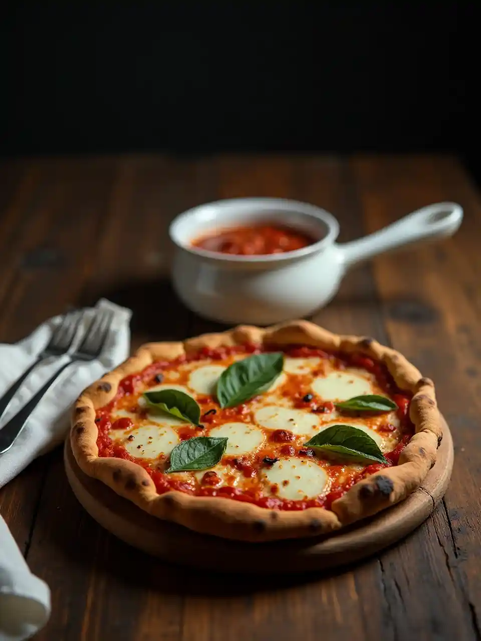 MwangMboga Symphony pizza na sufuria nyeupe ya nyanya kwenye meza ya mbao kwenye background nyeusi