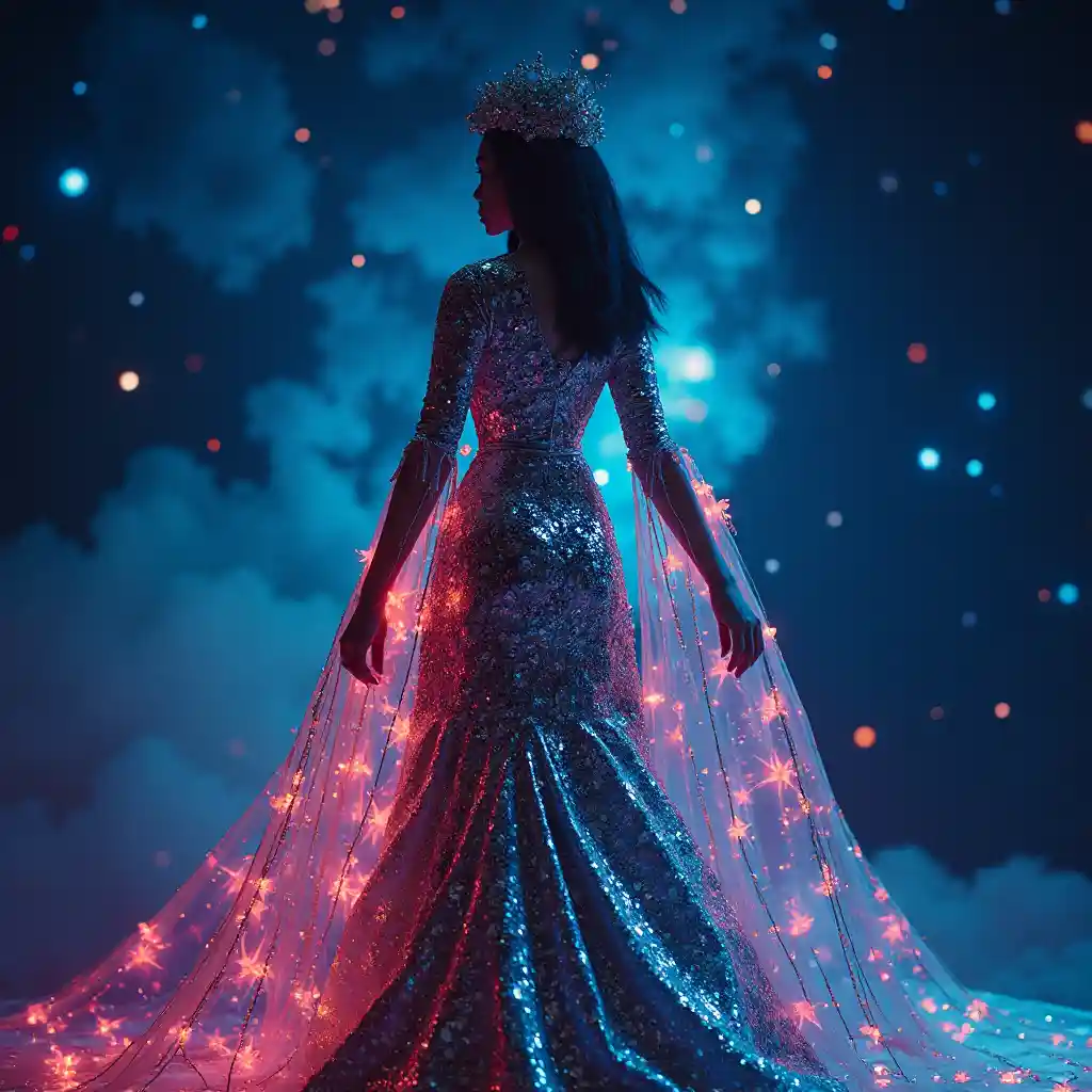 (nafasi nje mavazi Versace), (fashion ya baadaye), mifumo ya cosmic, nyota usiku background, rangi hai, kitambaa shimmering, mwangaza ethereal, maelezo tata, high fashion aesthetic, vibes nyingine, starlit mazingira, anga ya mbele, 4K ubora.