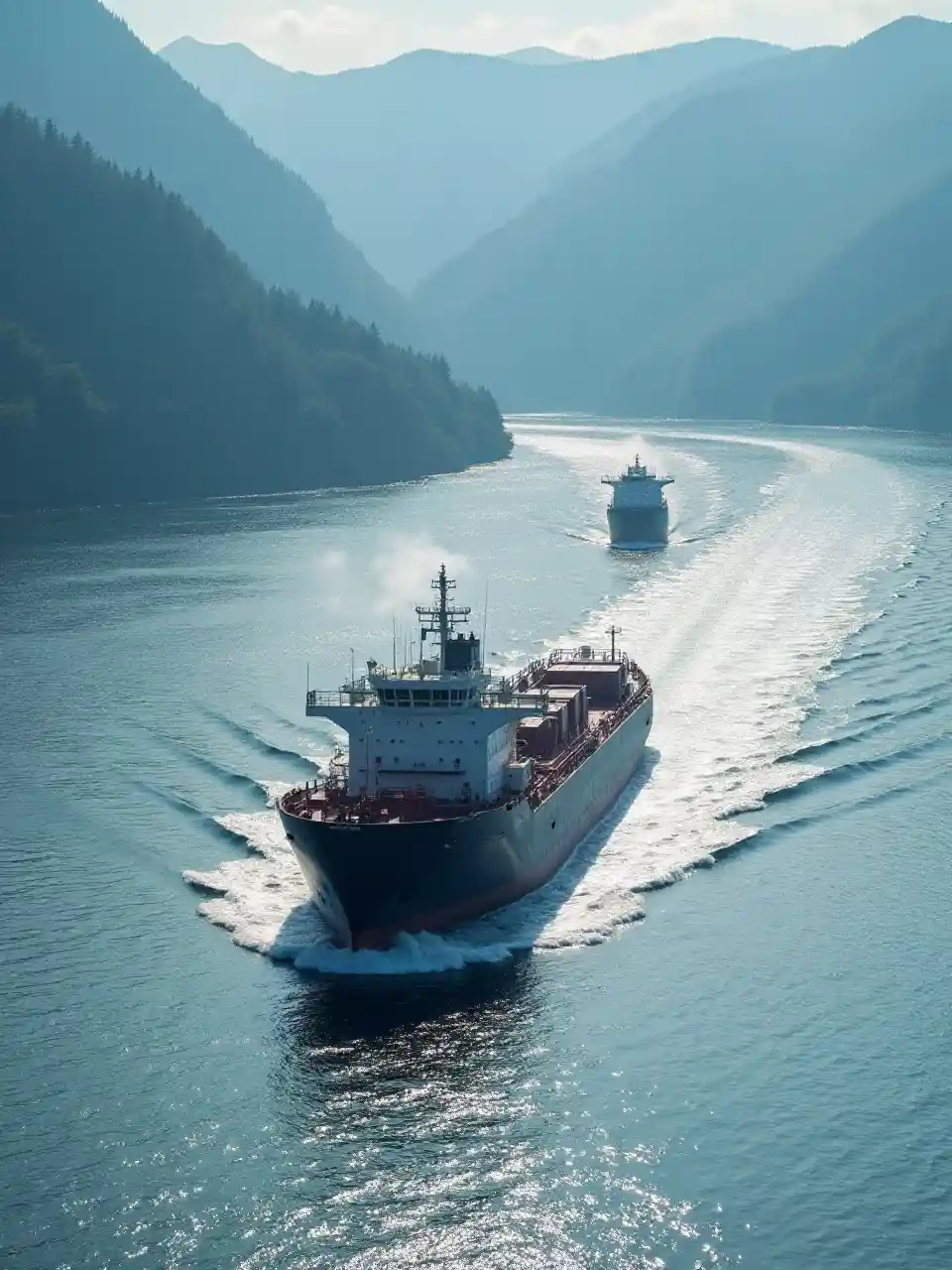 Meli mbili kubwa zinapanda kwa kasi katika maji ya bluu yenye kung'aa, na ndege hao wanaenda kwa kasi katika ghuba yenye amani iliyozungukwa na vilima vyenye misitu. Mahali hapo panaangazwa na nuru ya mchana, ambayo ni ya kawaida wakati wa alasiri, na inatoa mwangaza wa chini kwenye uso wa maji. Meli iliyo mbele, ambayo ni meli ya kubeba mizigo, inaonekana kuwa imara kwa sababu ya mwili wake wenye giza na muundo wake wenye usawaziko, ilhali ile iliyo nyuma, ambayo ni feri, ina umbo lenye kung'aa na inafaa zaidi kwa abiria. Moshi mdogo huinuka kutoka kwenye meli ya mizigo, na hivyo kuelezea jinsi bahari inavyoenda huku milima ikizunguka. Hali ya hewa huchochea watu wachunguze vitu kwa amani na kuona upatano kati ya utendaji wa wanadamu na ukuu wa asili.