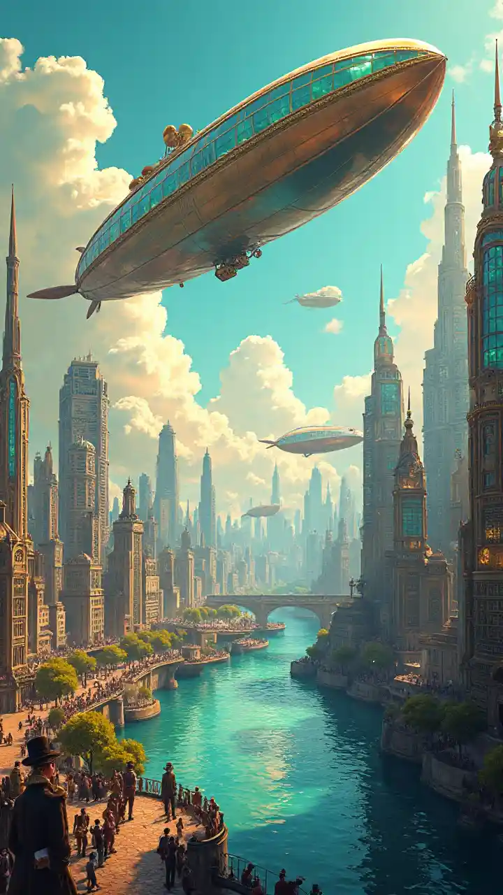 Create a vibrant hyper-detailed illustration of a retrofuturistic metropolis where Art Nouveau meets cyberpunk, bathed in warm golden-hour sunlight. Massive Art Deco-inspired zeppelins, adorned with intricate brass filigree and crystalline observation decks, float majestically through a cerulean sky dotted with cumulus clouds. The cityscape features a dramatic mix of gleaming chrome-and-glass skyscrapers with impossible geometries and ornate Victorian architecture, their surfaces reflecting prismatic light patterns. A winding azure river, reminiscent of classical oil paintings, bisects the urban landscape, its banks lined with cobblestone promenades and ornamental wrought-iron gaslamps emitting a soft cyan glow. Crowds in a striking blend of contemporary business attire and elaborate steampunk fashion - including top hats, brass goggles, and leather waistcoats - gather along emerald grass embankments. The scene is rendered in a cinematic 16:9 aspect ratio with atmospheric perspective, featuring ray-traced lighting effects and photorealistic textures. The composition follows the rule of thirds, with leading lines drawing the eye from the detailed foreground elements toward the awe-inspiring airships. The color palette combines rich sepia tones with electric teals and metallic golds, creating a harmonious blend of vintage and futuristic aesthetics. Rendered in the style of Studio Ghibli meets Syd Mead, with hints of art by John Harris and Craig Mullins, 8k resolution, volumetric lighting, ambient occlusion.