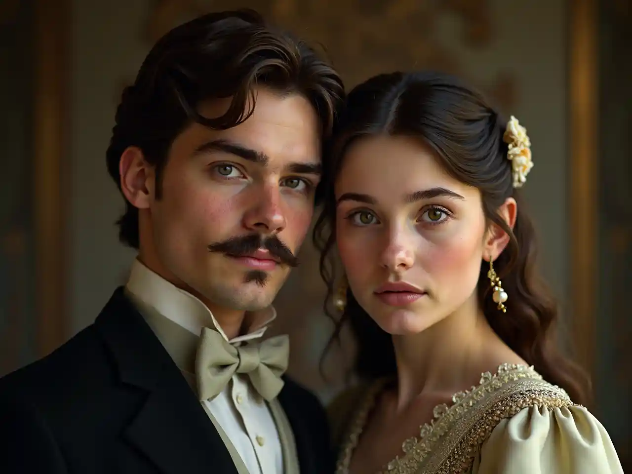 picha ya wanandoa vijana matajiri katika enzi ya Victoria, kijana mzuri wa miaka 19, na nywele za kahawia, ndevu, macho ya bluu, nguo za kawaida na za kifahari. na mpenzi wake, msichana mzuri wa miaka 13, na macho ya hazel, nguo za kifahari sana, mwaka wa 1894, Cinematic, lensi ya 35mm, f/1.8, taa ya sauti, taa ya ulimwengu m m m m m m m m m m m m m m m m m m m m m m m m m m m m m m m m m m m m m m m m m m m m m m m m m