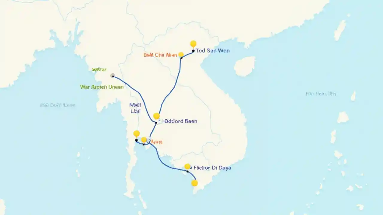 Ramani ya kina na rahisi ya Vietnam inayoonyesha miji mikubwa: Ho Chi Minh City, Da Nang, Hoi An, Hanoi, na Ha Long Bay. Ramani inapaswa kujumuisha njia za usafiri zilizo wazi kati ya miji, zilizowekwa kama ndege (Ho Chi Minh City hadi Da Nang na Da Nang hadi Hano) na njia za gari (Da Nang hadi Hoi, Hano hadi Ha Long). Kila mji unapaswa kuandikwa, na ikoni ya kuona au maelezo madogo kwa kivutio kikubwa cha watalii, kama vile War Remnants Museum katika Ho Chi Minh City, Milima ya Marumaru katika Da Nang, Hoi An Old Town katika Hoi An, Old Quarter katika Hanoi, na Ha Long Bay Cruise katika Ha Long Bay. Ramani inapaswa kuwa safi, wazi, na rahisi kusoma, na kuwa na alama rahisi za rangi mbalimbali za kila jiji na vivutio.