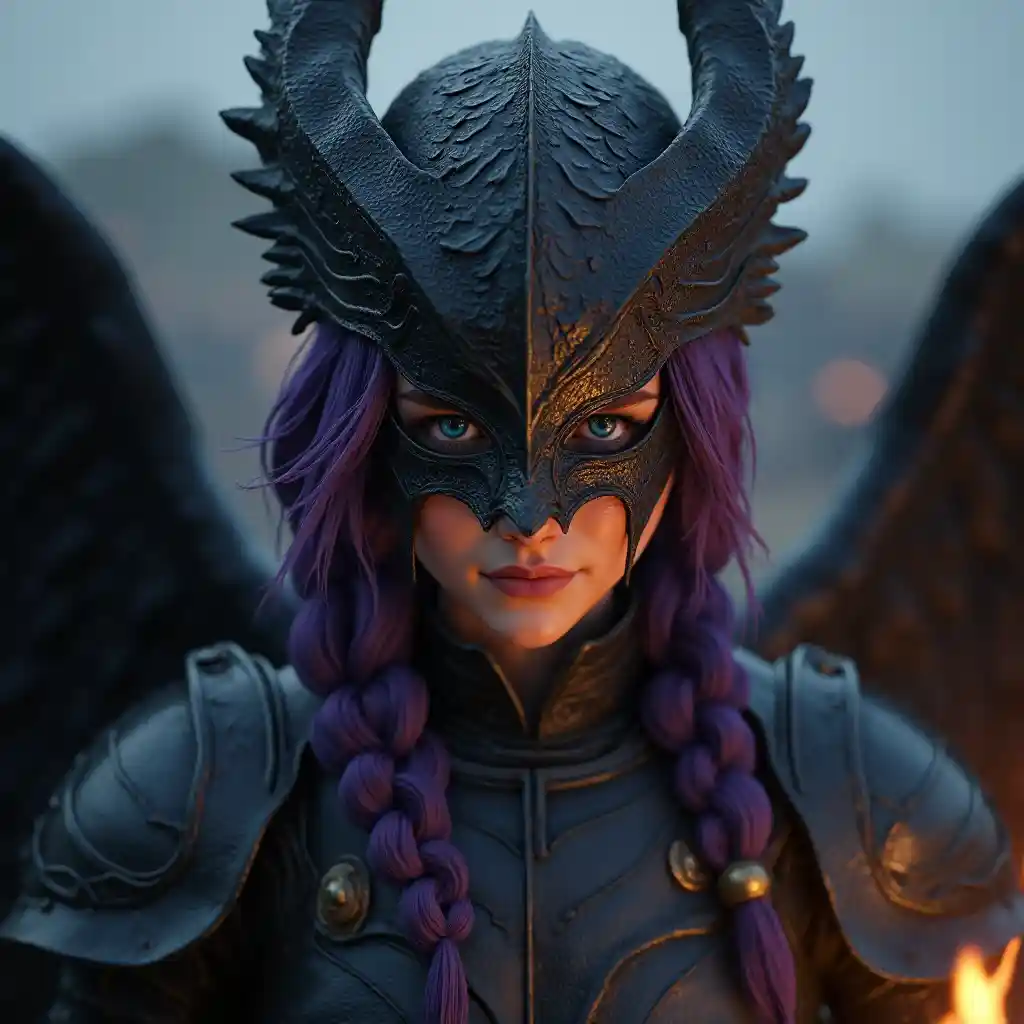 <mymodel>CGI uhuishaji, sanaa digital, 20 mwenye umri wa miaka Viking mwanamke na macho ya mwanga bluu na nywele zambarau, kwa bidii kuangalia juu ya amri ya vita na askari wake, nyeusi dragon ukubwa kofia kufunika uso, mabawa ya joka kutoka nyuma yake, filamu poster, silaha mwanga na mienge, nguo nyeusi, nyeusi dragon ukubwa silaha rangi, nywele zambarau, moja braid chini ya bega na taji ya dhahabu, tabasamu, injini isiyo ya kweli 8k octane, taa 3D, picha ya karibu, silaha kamili