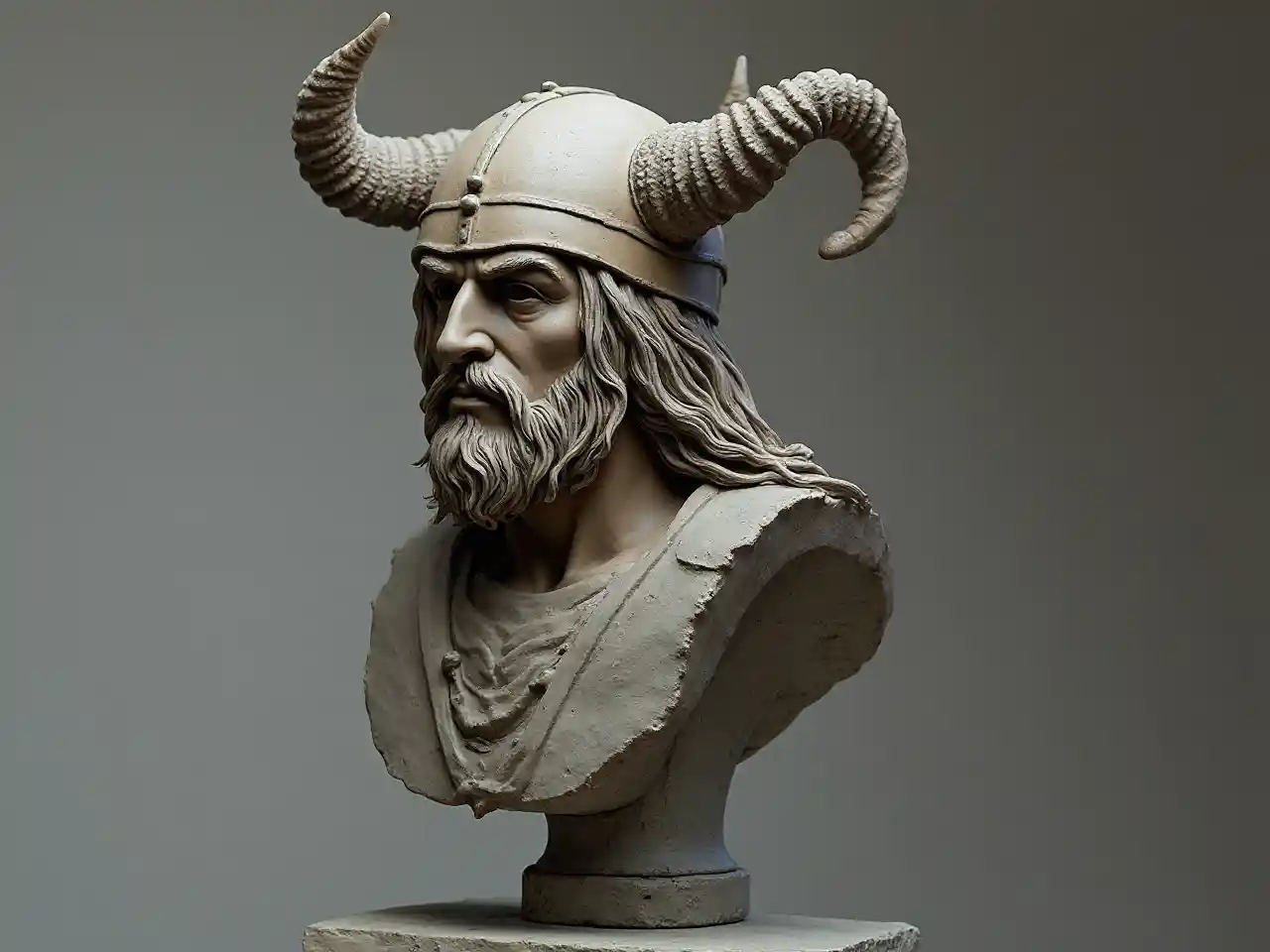 GraysonSanamu Bust ya mtu na kofia ya chuma na pembe mbili, mtu ana nywele ndefu na macho makali na cheekbones high na bila nde