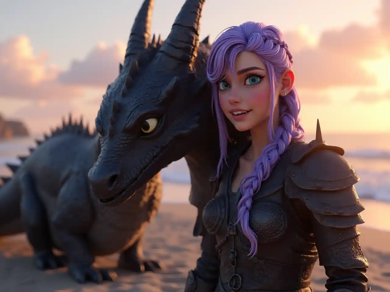 CGI Animation, sanaa digital, 20 mwenye umri wa miaka Viking mwanamke na macho ya wazi ya bluu, mavazi ya zambarau, bla bla, yeye ni furaha, nywele zambarau na vipande vya zambarau, amesimama kwenye pwani wakati wa jua, moja braid chini ya bega, yeye amesimama karibu na dragoni yake nyeusi, injini ya 16k octane, 3d taa, bla bla