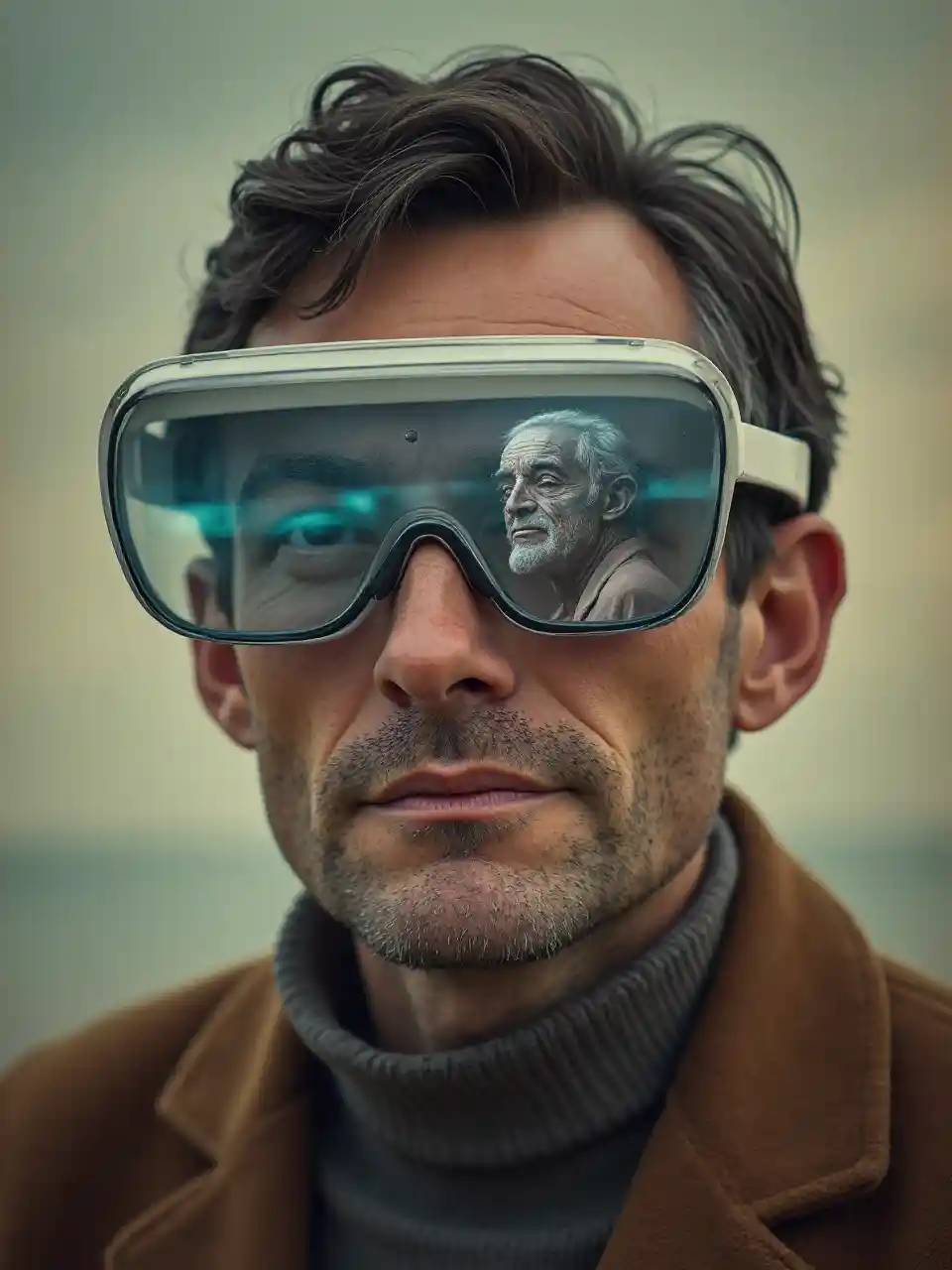 mtu kuvaa miwani augmented ukweli katika mtindo wa picha vintage kutoka miaka ya 1960, kuchapishwa picha ya zamani alb. Picha kwenye miwani ya ukweli iliongezwa lazima iwe kutoka karne ya 21