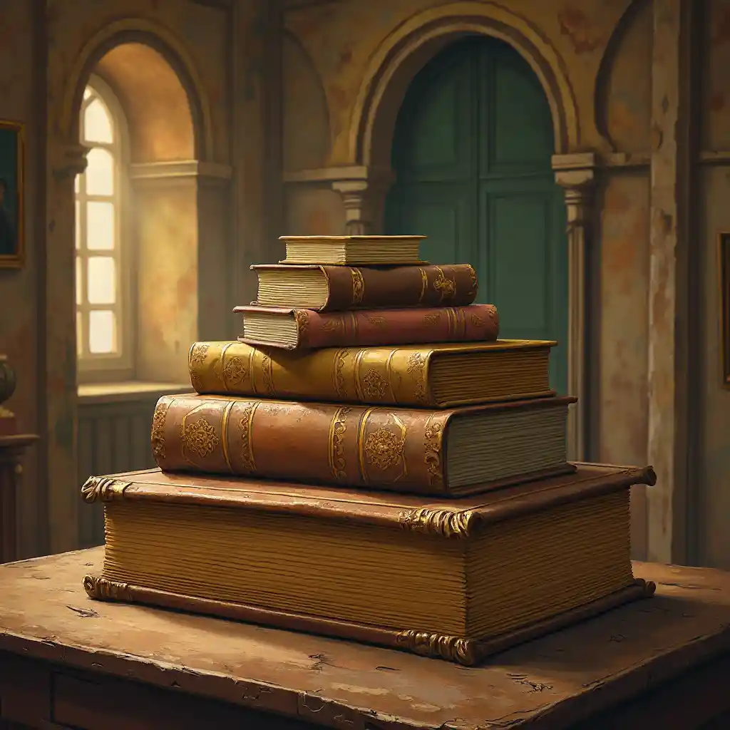 Picha ya zamani ya kitabu kikubwa chenye muundo tata, kilicho na vitabu vidogo vingi juu yake, na kilicho katika chumba chenye kupendeza na upindo wenye kupendeza. Rangi zenye joto na rangi za dhahabu huleta mazingira mazuri. Aliongoza na mtindo wa kisanii wa Brom, akumbusho wa uchawi kukusanya kazi ya sanaa. Maelezo ya picha halisi, kukamata charm ya ulimwengu wa sanaa ya fantasy, textures ultra-ndani na mazingira ya kuvutia.