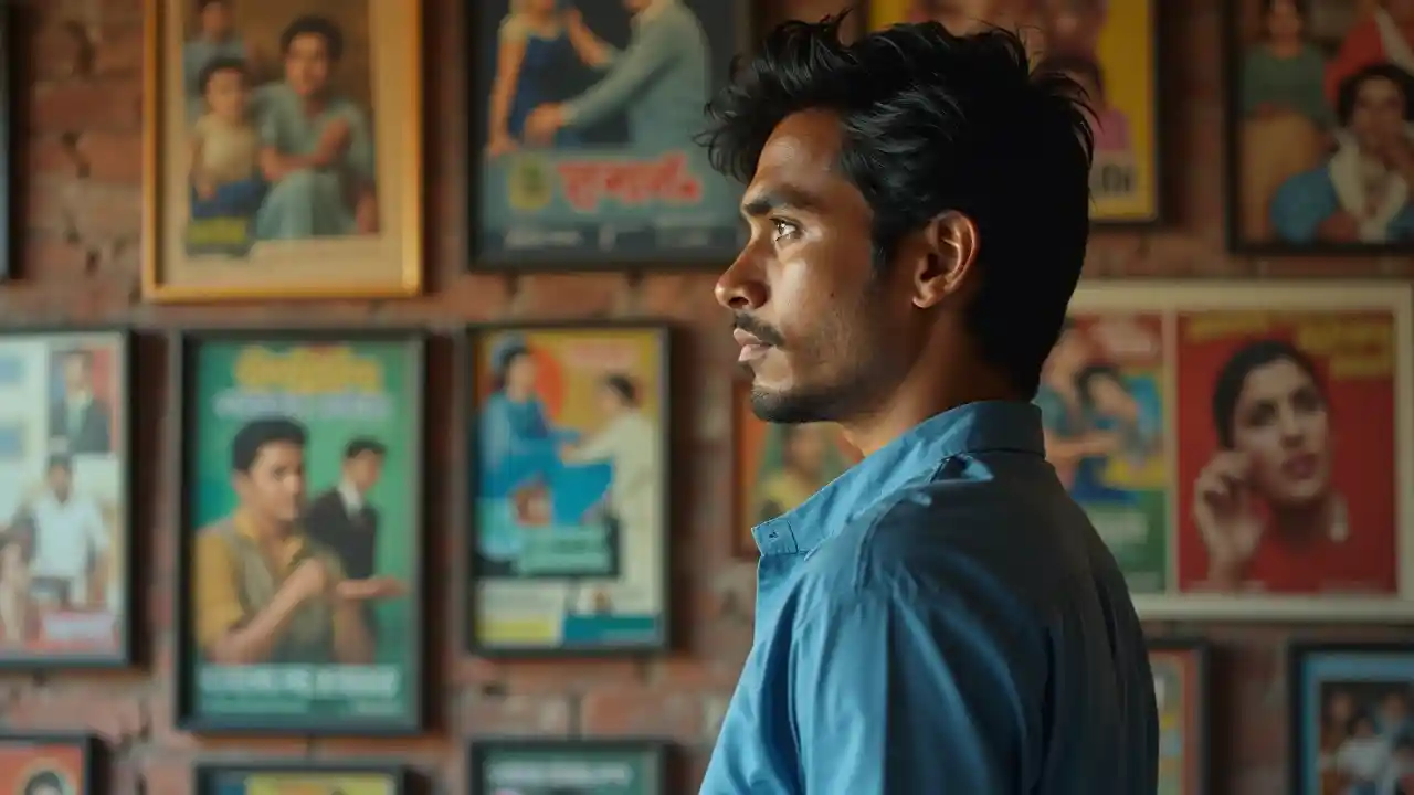 Kijana mmoja anasimama kwa makini mbele ya picha za sinema za zamani. Nywele zake nyeusi zimepambwa vizuri, naye anavaa kurta ya bluu, ambayo inatofautiana na mandhari ya matofali nyuma yake, ambayo imepambwa kwa michoro. Rangi na muundo mbalimbali wa mabango, yenye mandhari za sinema za Kibengali na picha za kawaida, hupa mandhari hali ya kusikitika, ikionyesha shauku ya sinema. Nuru nyangavu inaingia, ikiangaza uso wake na kuongeza hali ya kutafakari, huku akitazama kando, labda akitafakari juu ya hadithi zilizo kwenye kuta zilizomzunguka.